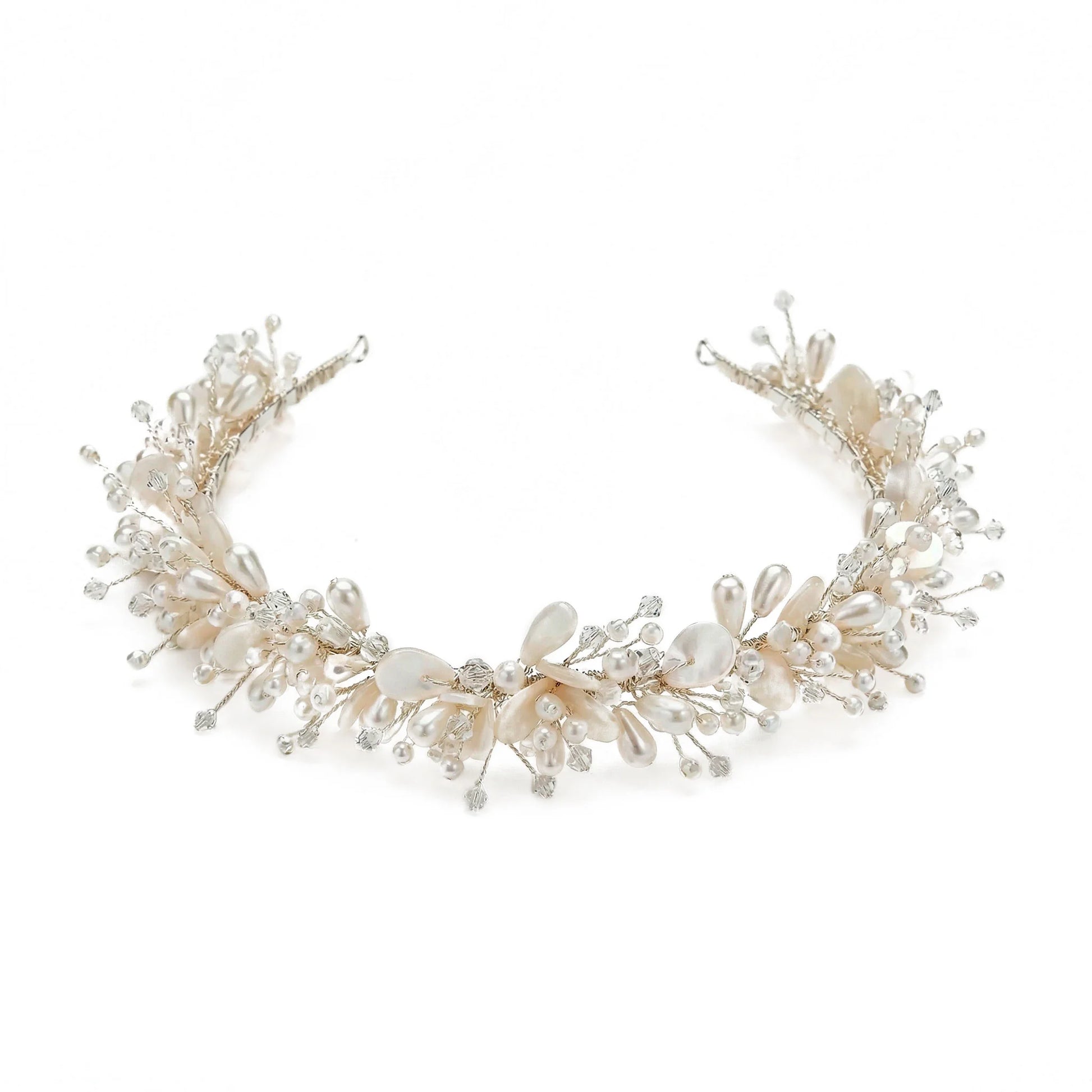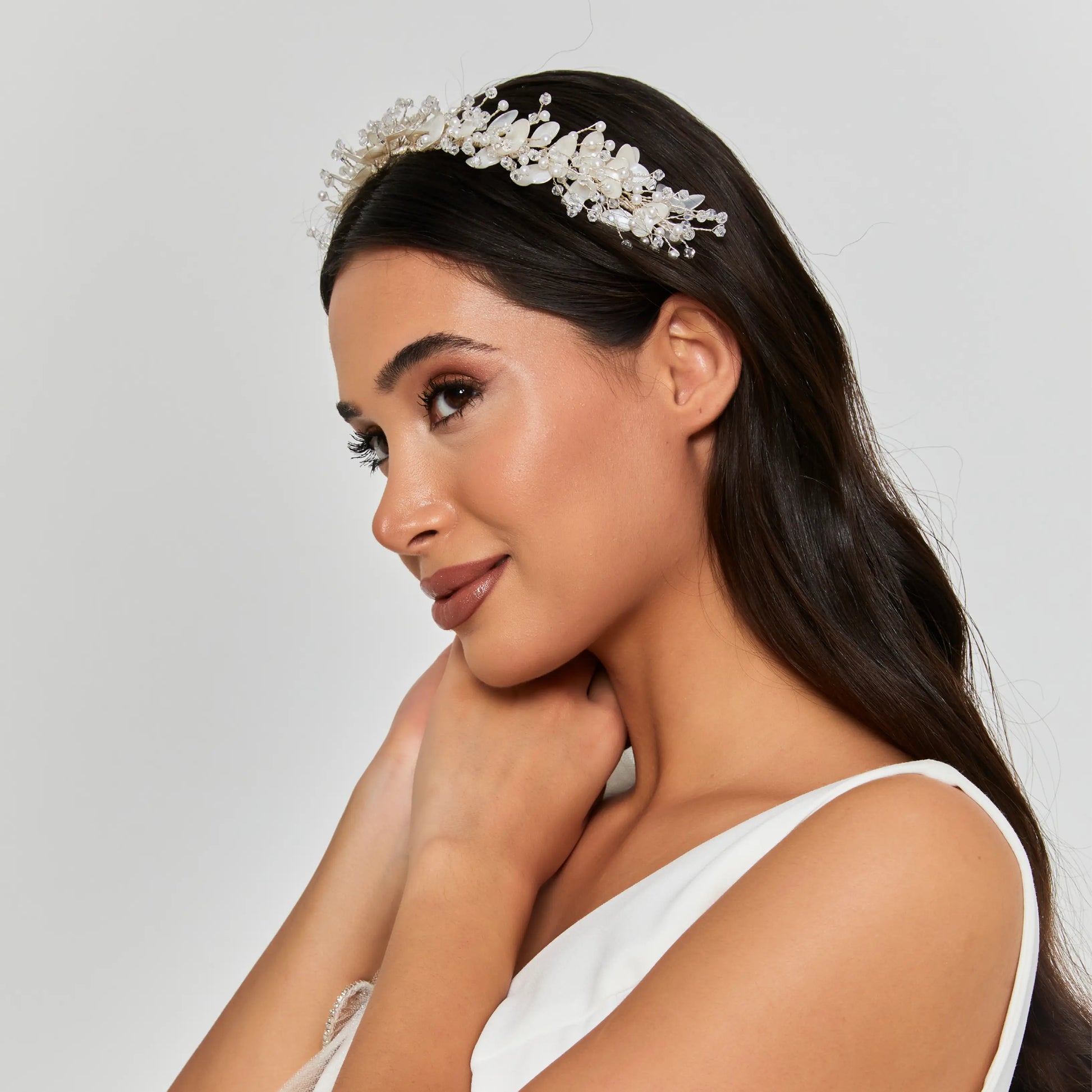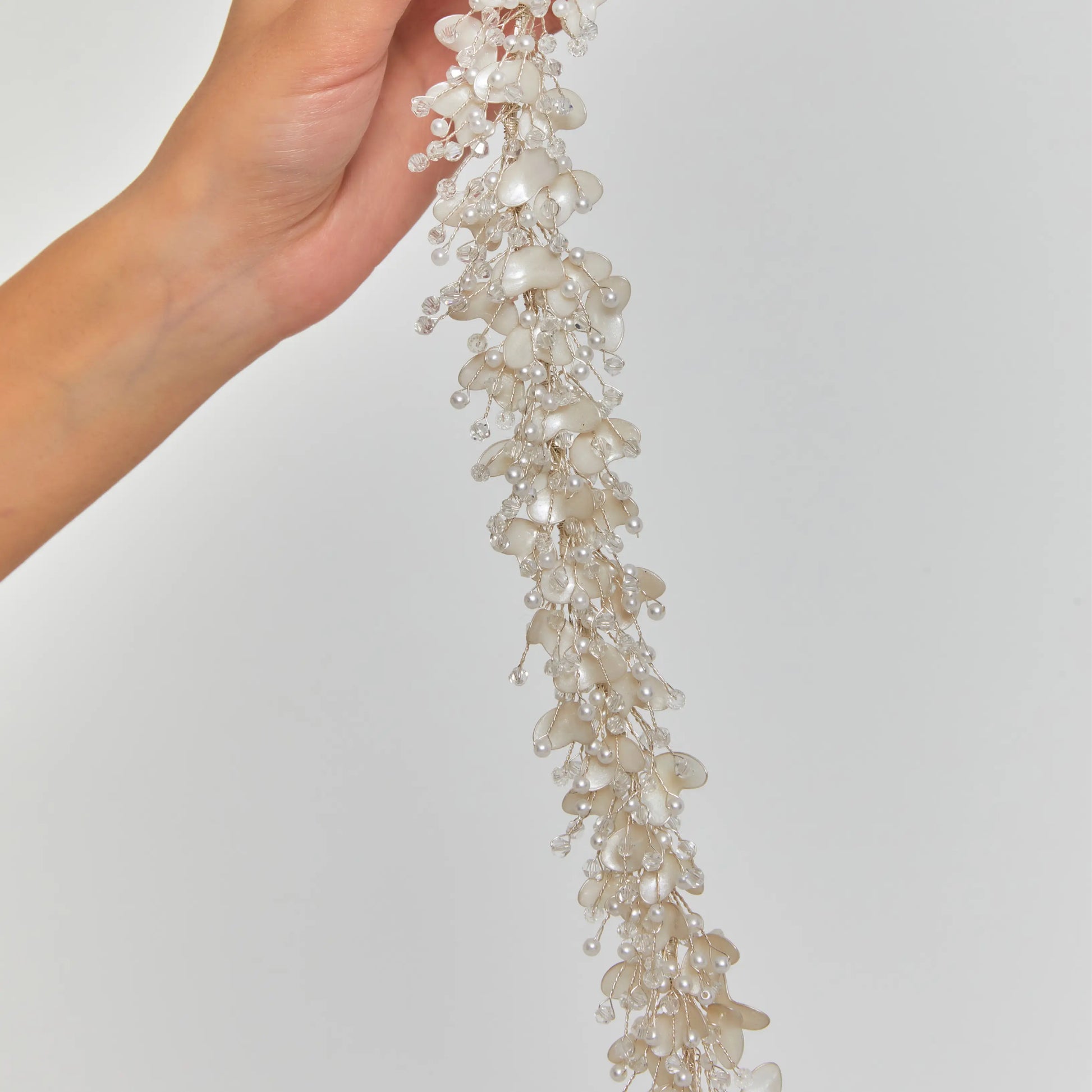 Imperio es un tocado majestuoso que combina pétalos delicadamente elaborados con perlas y cuentas que capturan la luz con sutileza. Su diseño evoca la grandeza y la elegancia de una corona imperial, fusionando la suavidad floral con la nobleza de los detalles brillantes. Cada elemento está dispuesto con armonía, creando un efecto etéreo y sofisticado, pensado para una novia que desea sentirse como la soberana de su propio día. Imperio es más que un accesorio: es un símbolo de poder, belleza y refinamiento.