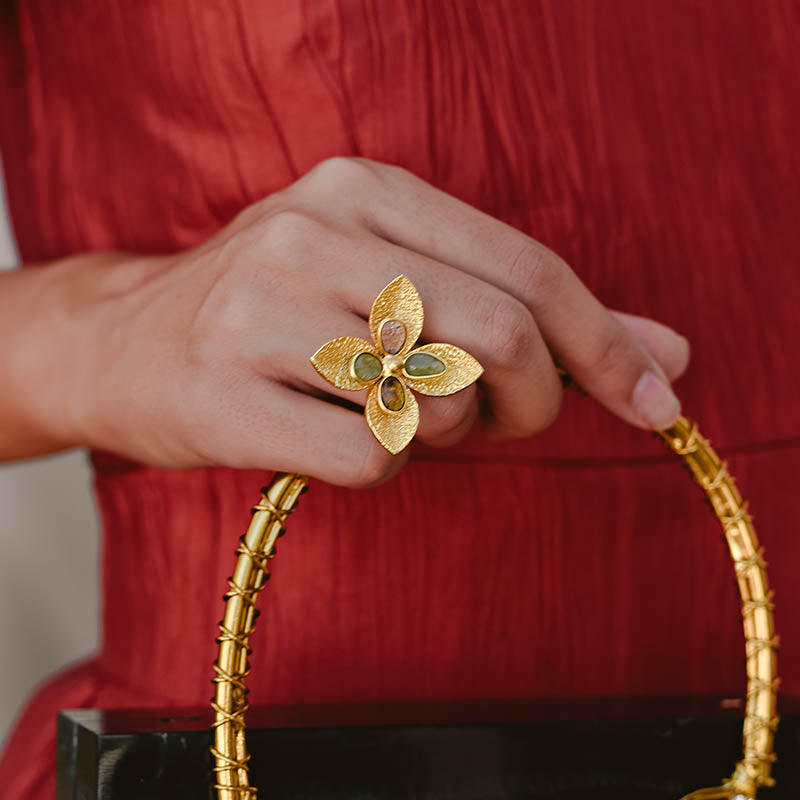 Imagina la delicadeza de nuestro anillo con forma de flor de cuatro pétalos, cada uno adornado con una piedra preciosa cerca del centro. Este encantador anillo, además de su belleza, ofrece la comodidad de ser ajustable, garantizando que se adapte a todas.
