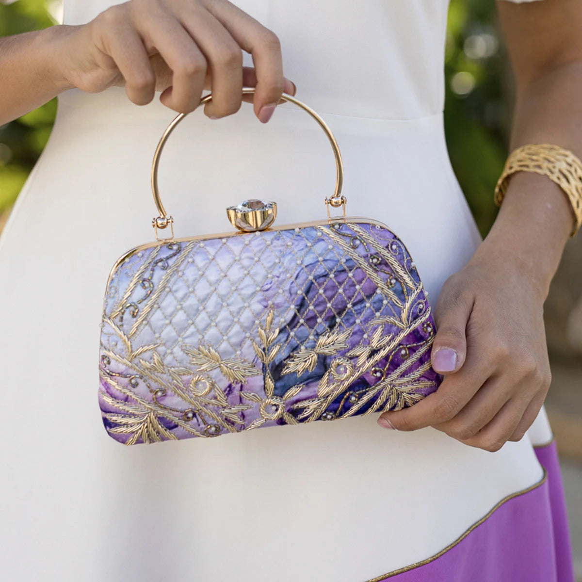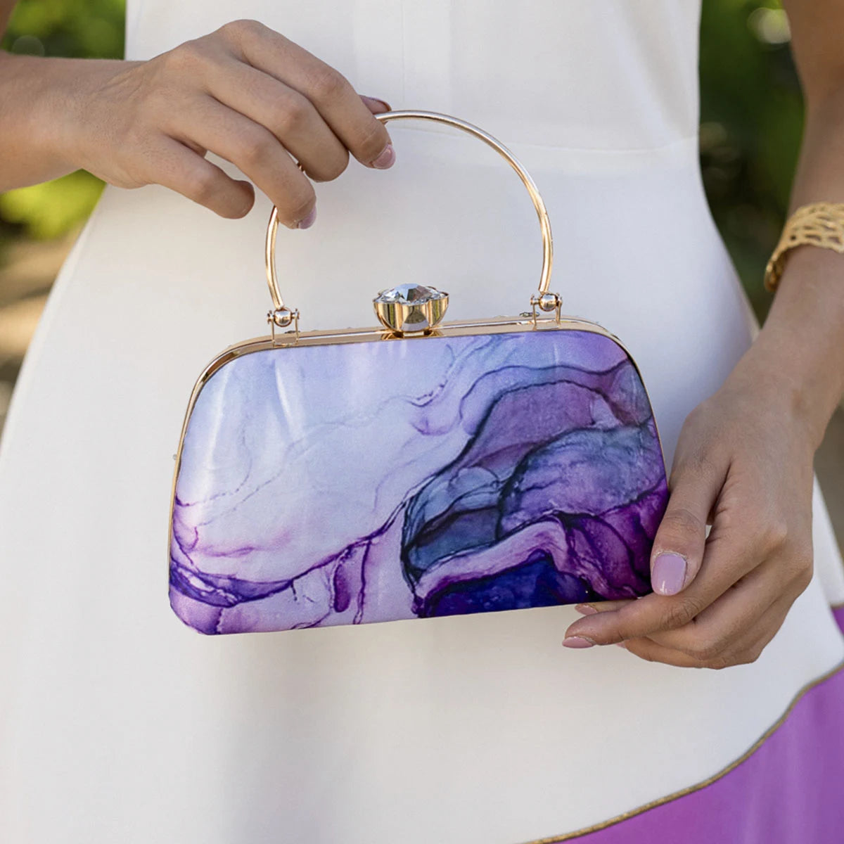 El bolso Marmeta de Occeanis combina elegancia y sofisticación. Su diseño con bordes curvos y un asa también curva hace que destaque en el look y lo hace perfecto para llevarlo cómodamente en la muñeca.