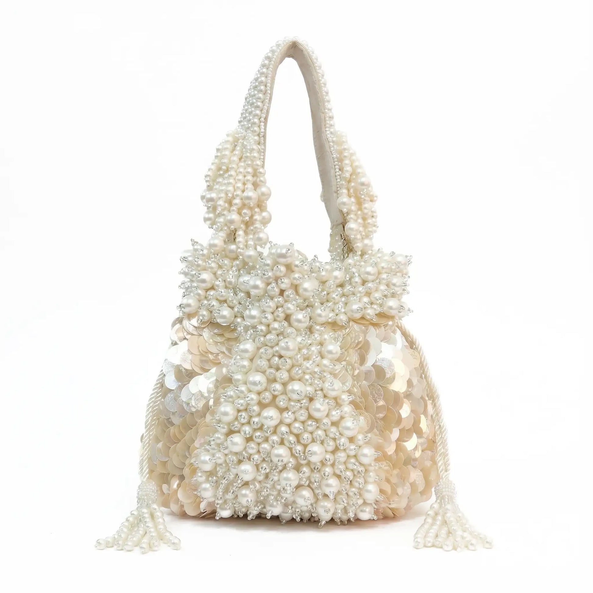 Con su forma envolvente tipo sobre y un delicado trabajo de pedrería cosida a mano, este modelo destaca por su bordado simétrico que recuerda a flores estilizadas, abanicos o figuras danzantes. Un guiño a lo exótico, lo elegante y lo atemporal.
