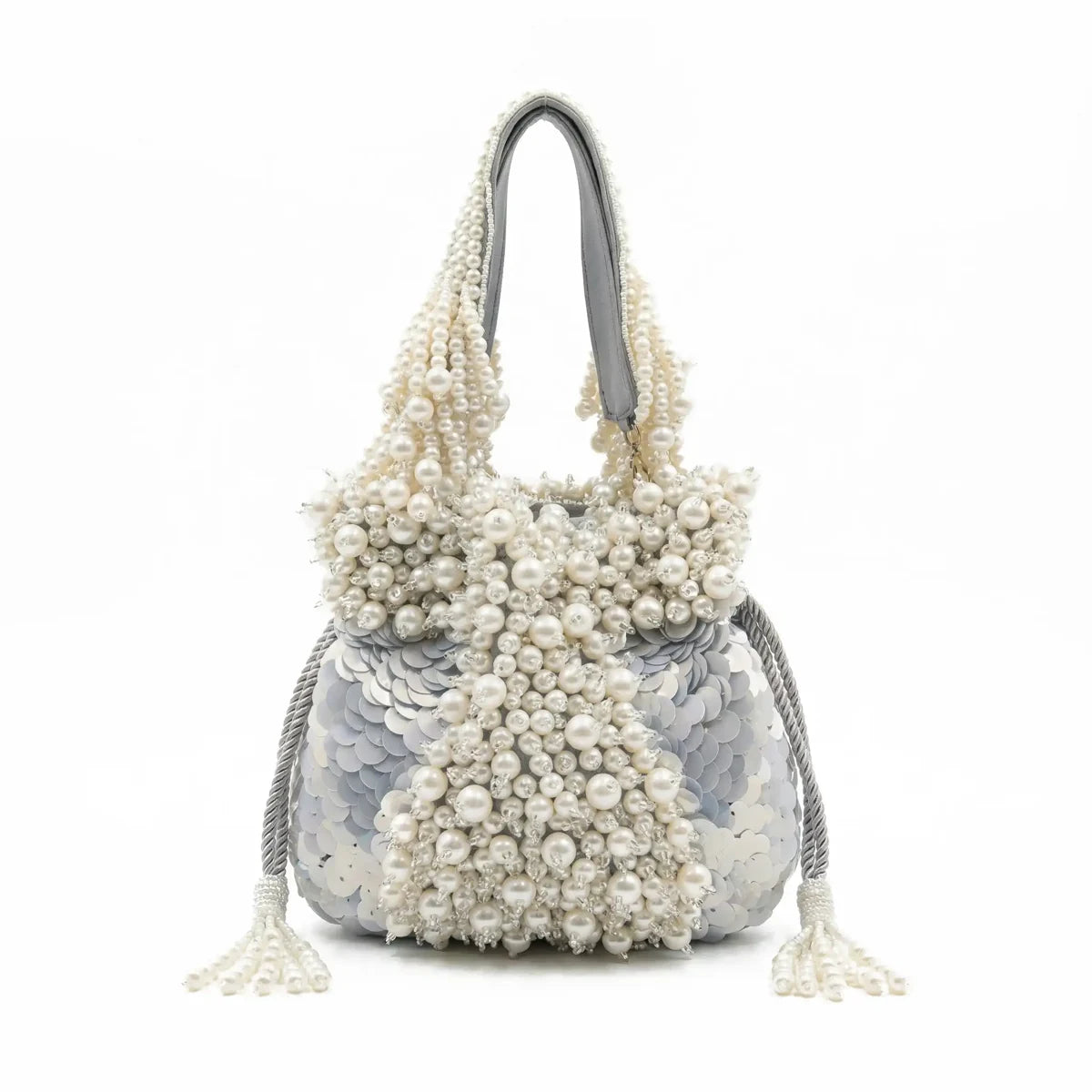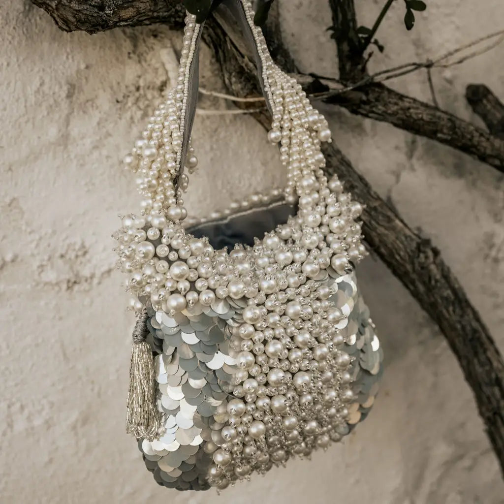 Con forma de bombonera y un diseño cuidadosamente trabajado a mano, esta pieza se cubre de perlas y lentejuelas que reflejan la luz con un brillo suave y envolvente. El asa doble también decorada y los cordones rematados con detalles brillantes hacen que cada parte del bolso tenga encanto propio.