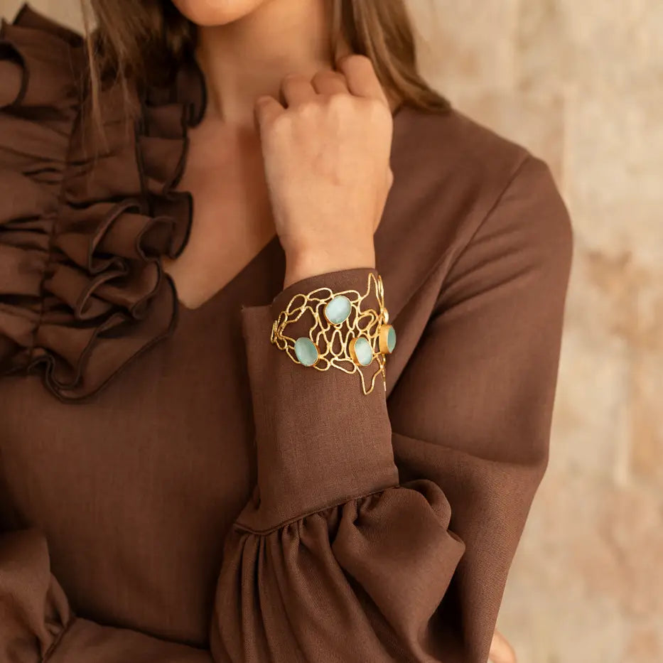 Brazalete formado por diferentes líneas que se entrecruzan y sostienen varias piedras. Un diseño único y muy vistoso que aporta originalidad y combina fácilmente con distintos looks.