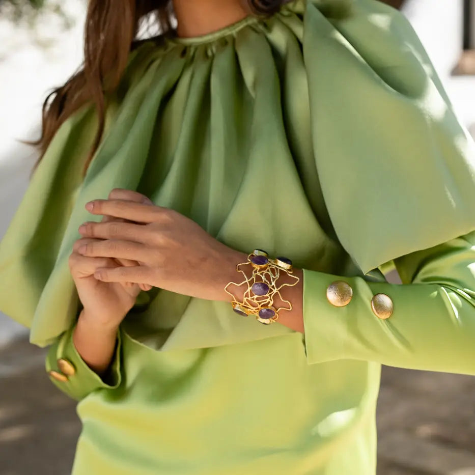 Brazalete formado por diferentes líneas que se entrecruzan y sostienen varias piedras. Un diseño único y muy vistoso que aporta originalidad y combina fácilmente con distintos looks.