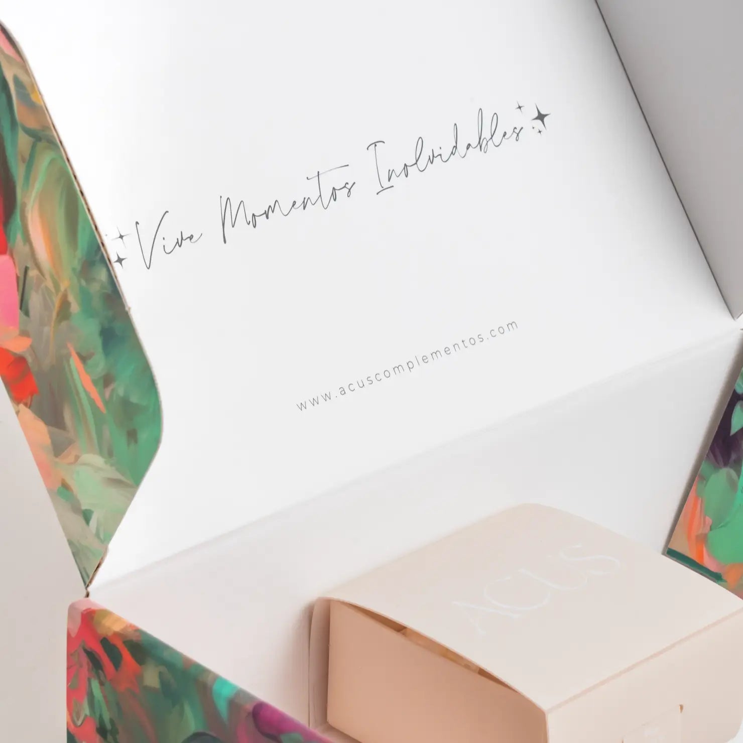 La caja de envíos de ACUS está diseñada para que cada pedido llegue protegido y con una presentación que enamora. Su estampado característico refleja la esencia artesanal y alegre de la marca, haciendo que abrir un paquete sea casi tan especial como descubrir lo que hay dentro.