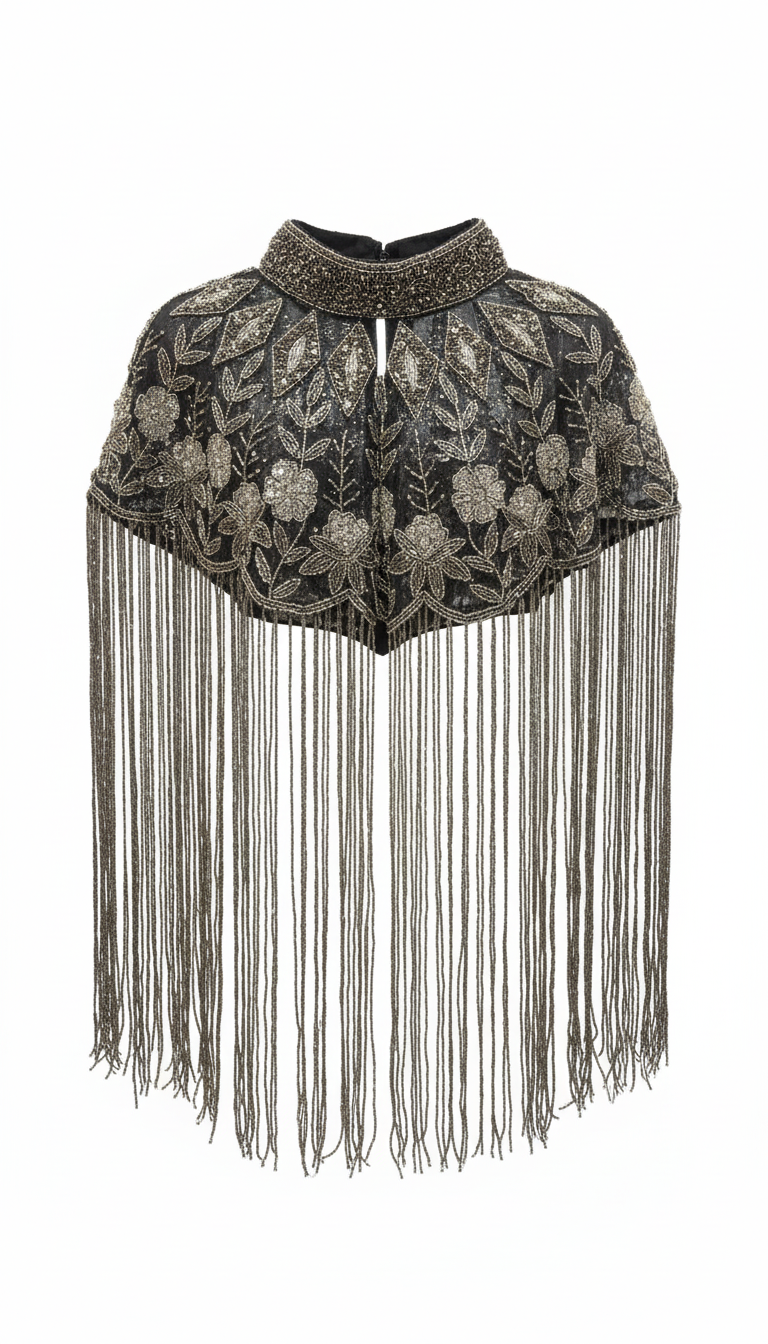 Descubre la capa joya que transforma cualquier look en una obra maestra artesanal. Hecha a mano en India con un minucioso trabajo de bordado que evoca formas florales y hojas estilizadas, su textura vibrante y delicada aporta movimiento y sofisticación con cada gesto. Al llevarla, sentirás una elegancia envolvente que despierta miradas y aporta un toque único de distinción.