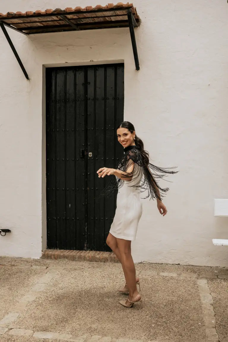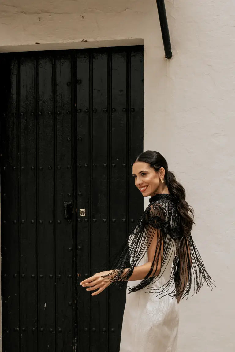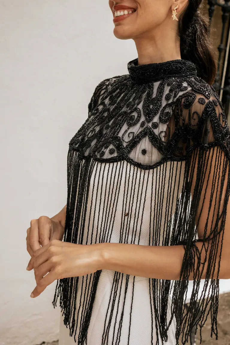 Esta capa joya es puro magnetismo. Su diseño con flecos largos y movimiento hipnótico convierte cualquier paso en una declaración de intenciones. El contraste entre la transparencia del tul bordado y la fuerza de los detalles la hacen irresistible. No se trata solo de vestir, sino de conquistar con estilo.