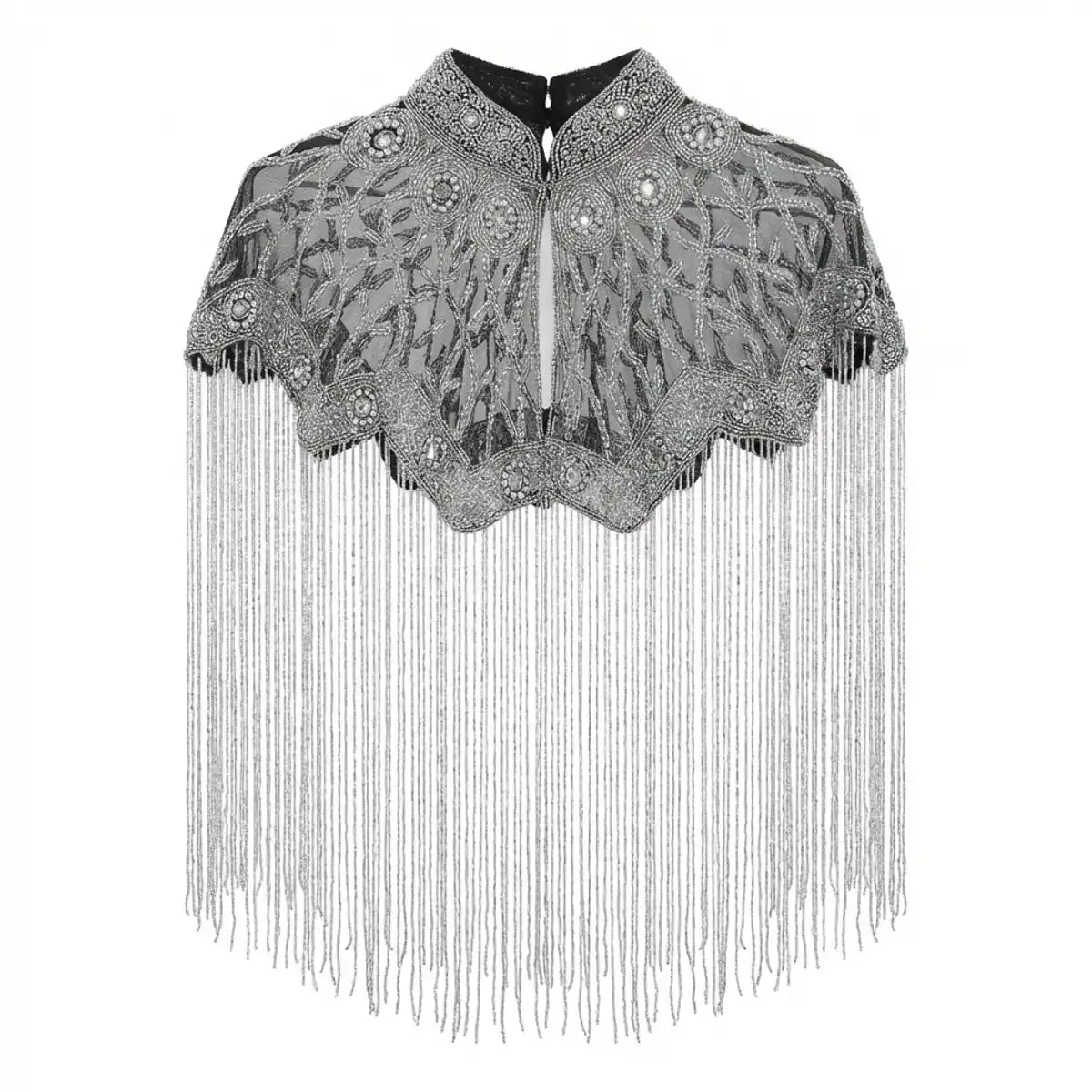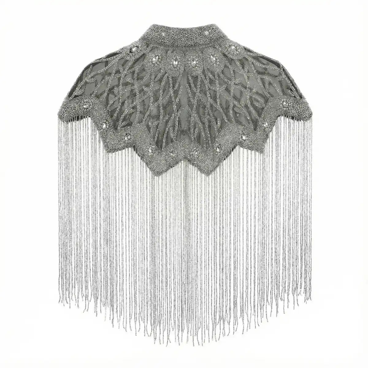 Esta capa joya artesanal, hecha con delicadeza en India, destaca por su forma semicircular que recuerda un abanico ornamentado, perfectamente adornado con intrincados bordados y hilos que caen en cascada como suaves flecos. Al llevarla, transmite una sensación de elegancia fluida y movimiento, envolviendo el cuerpo con un halo de sofisticación y exclusividad. Ideal para combinar sobre vestidos o blusas, esta pieza versátil se adapta tanto a eventos formales como a looks más casuales con personalidad.