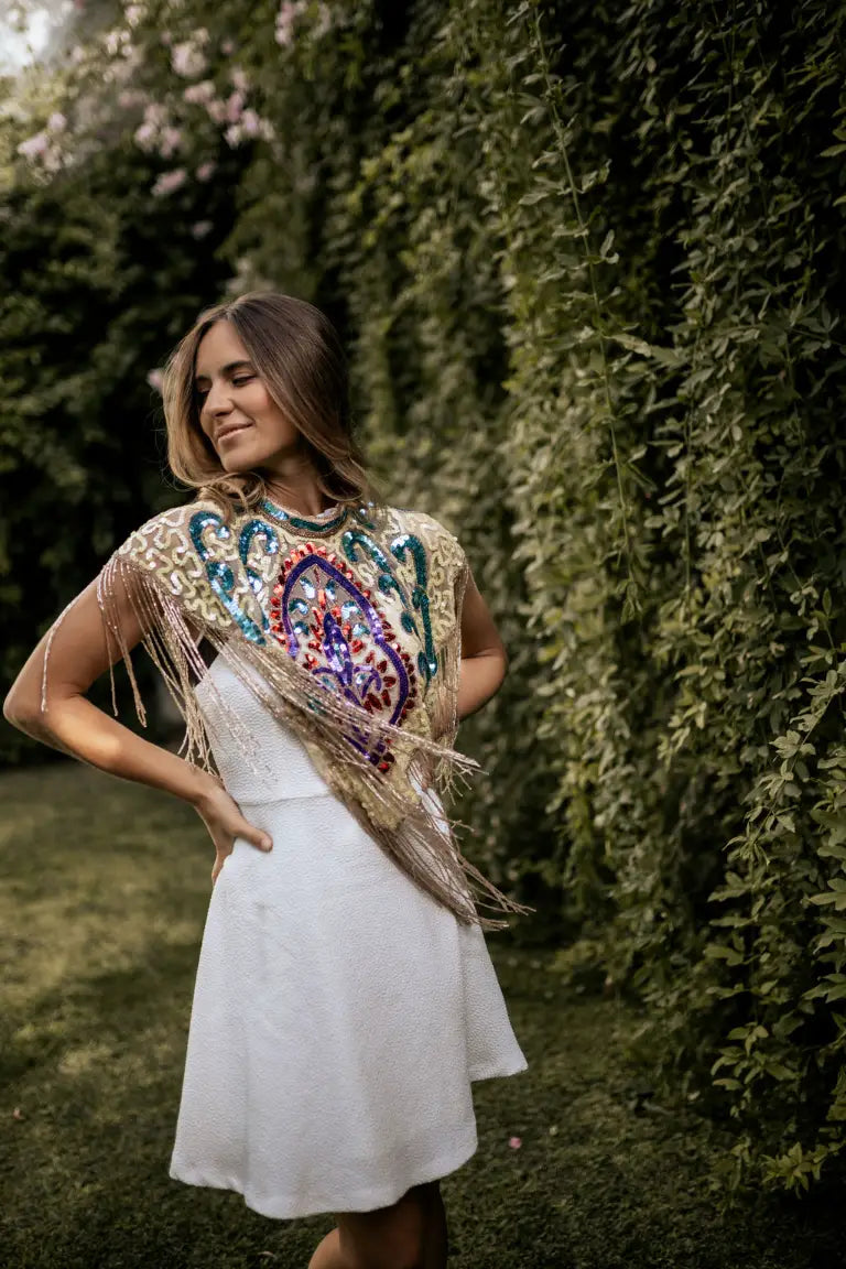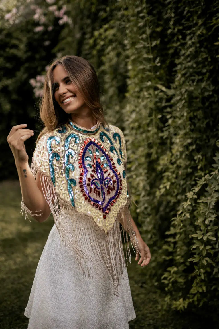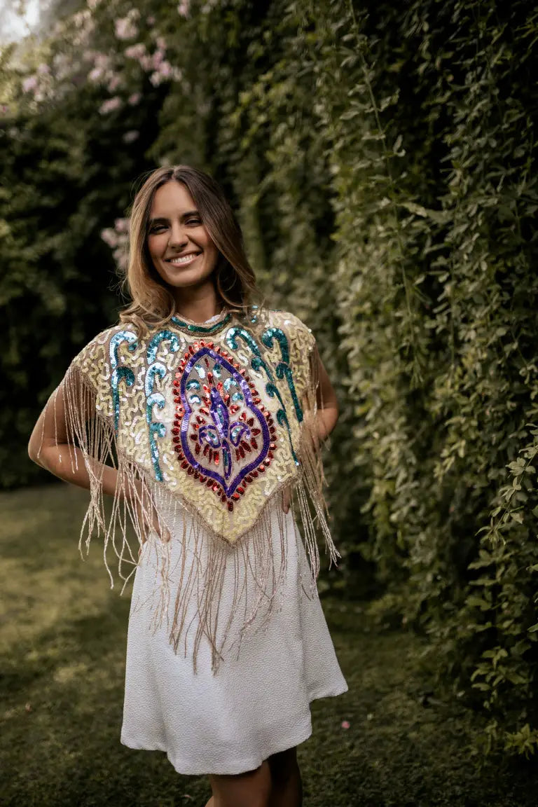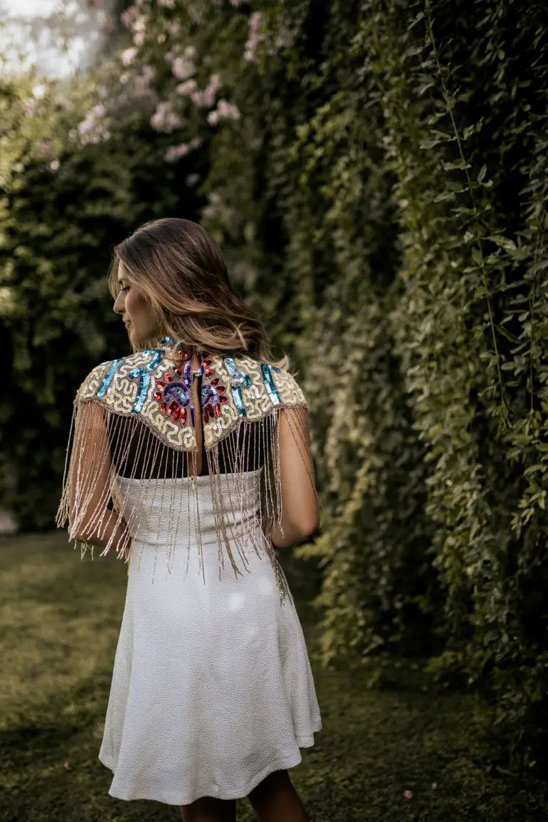 Las lentejuelas y cuentas están dispuestas en líneas curvadas que crean un efecto dinámico y elegante. En la parte posterior, un arabesco se convierte en el protagonista, añadiendo un detalle distintivo y lleno de carácter. Este diseño convierte la capa en una pieza única que atrae todas las miradas.