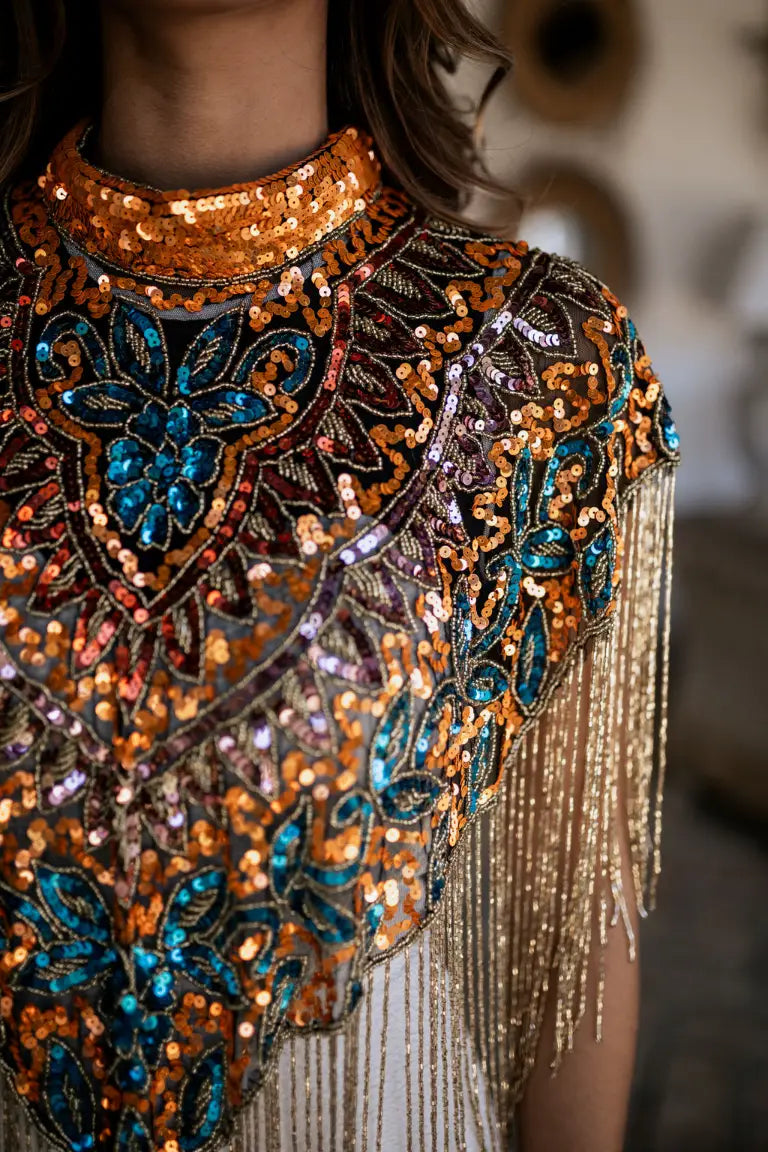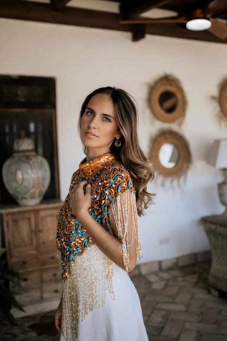 Las lentejuelas y cuentas están dispuestas en detalles distribuidos por toda la capa, creando un efecto dinámico y elegante. En la parte posterior, un arabesco se convierte en el protagonista, añadiendo un detalle distintivo y lleno de carácter. Este diseño convierte la capa en una pieza única que atrae todas las miradas.