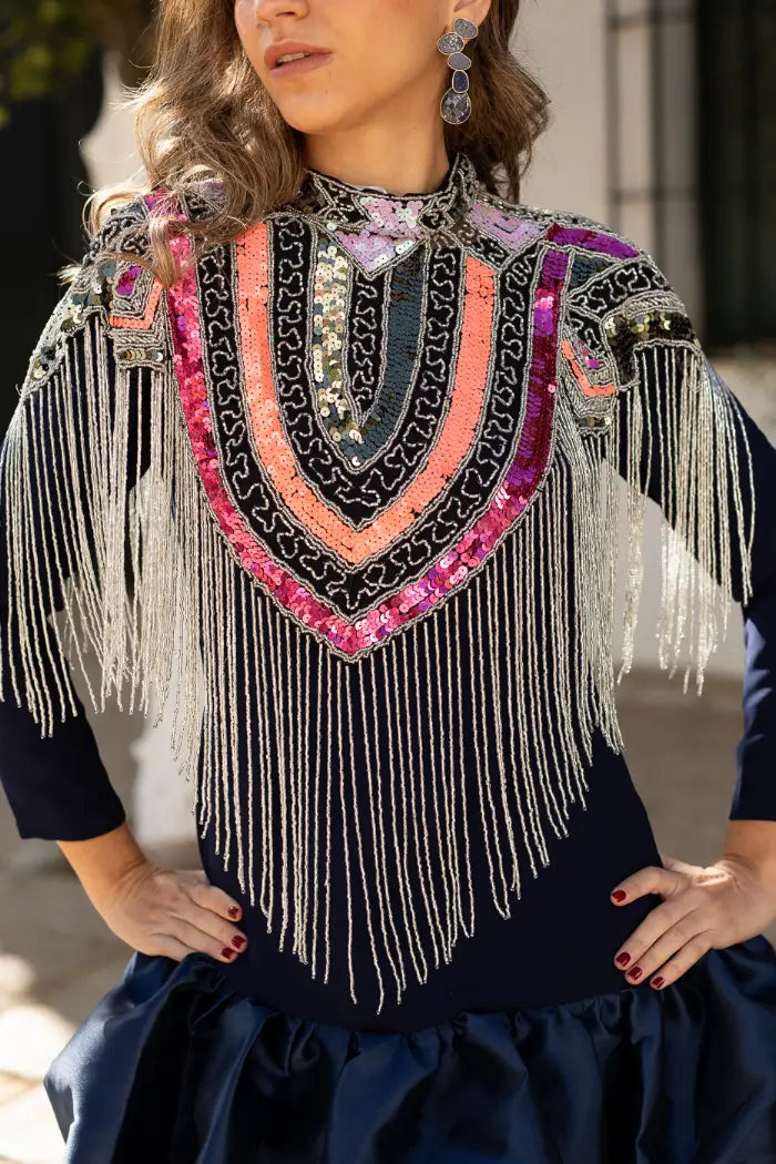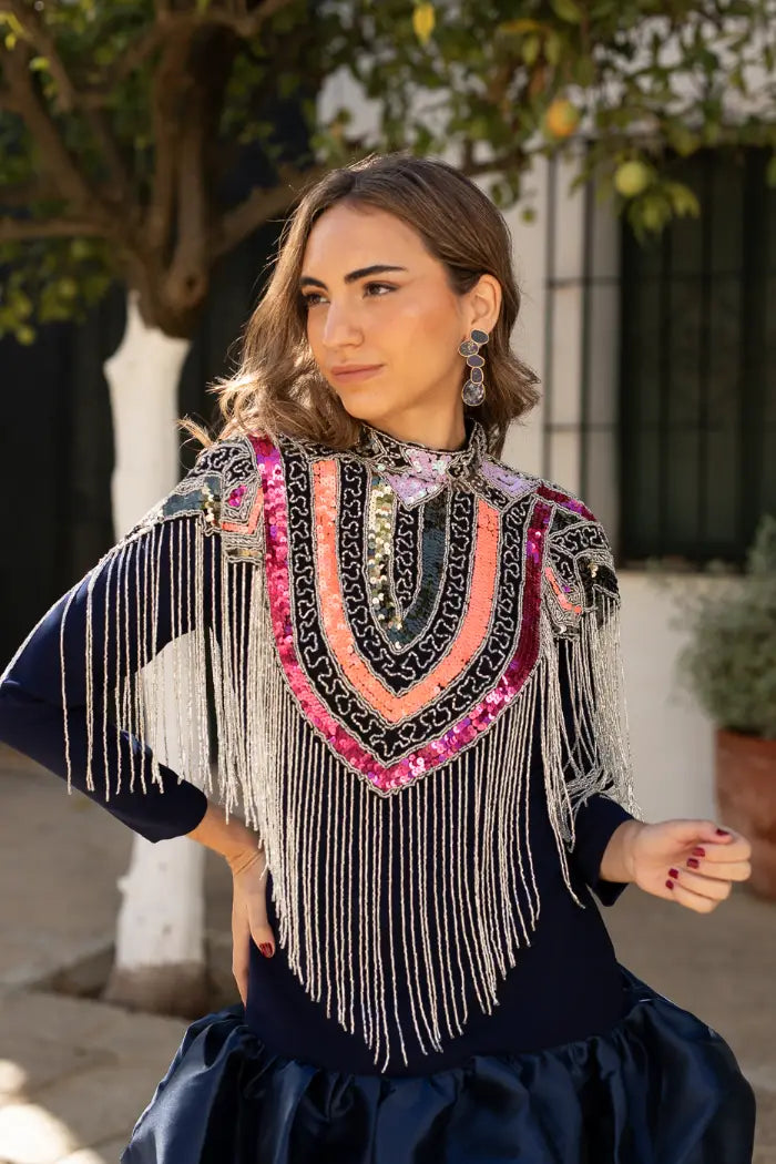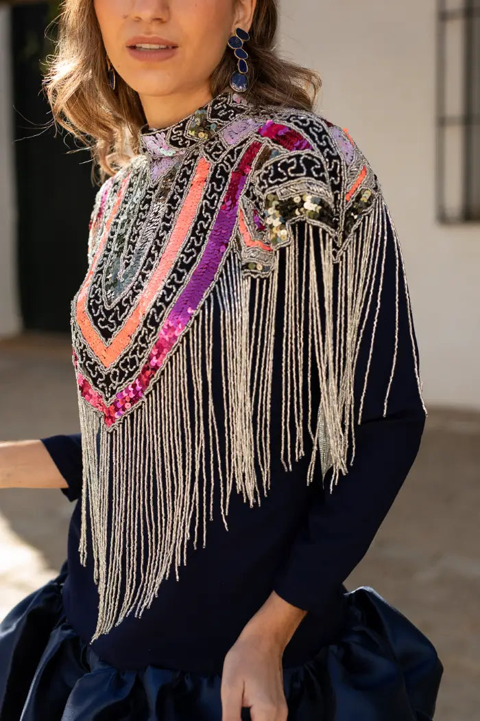 Las lentejuelas y cuentas están distribuidas en líneas gruesas de colores que contrastan a la perfección, creando un efecto visual dinámico y llamativo por toda la capa. Este diseño convierte la prenda en una pieza única y artística, llena de energía y personalidad.