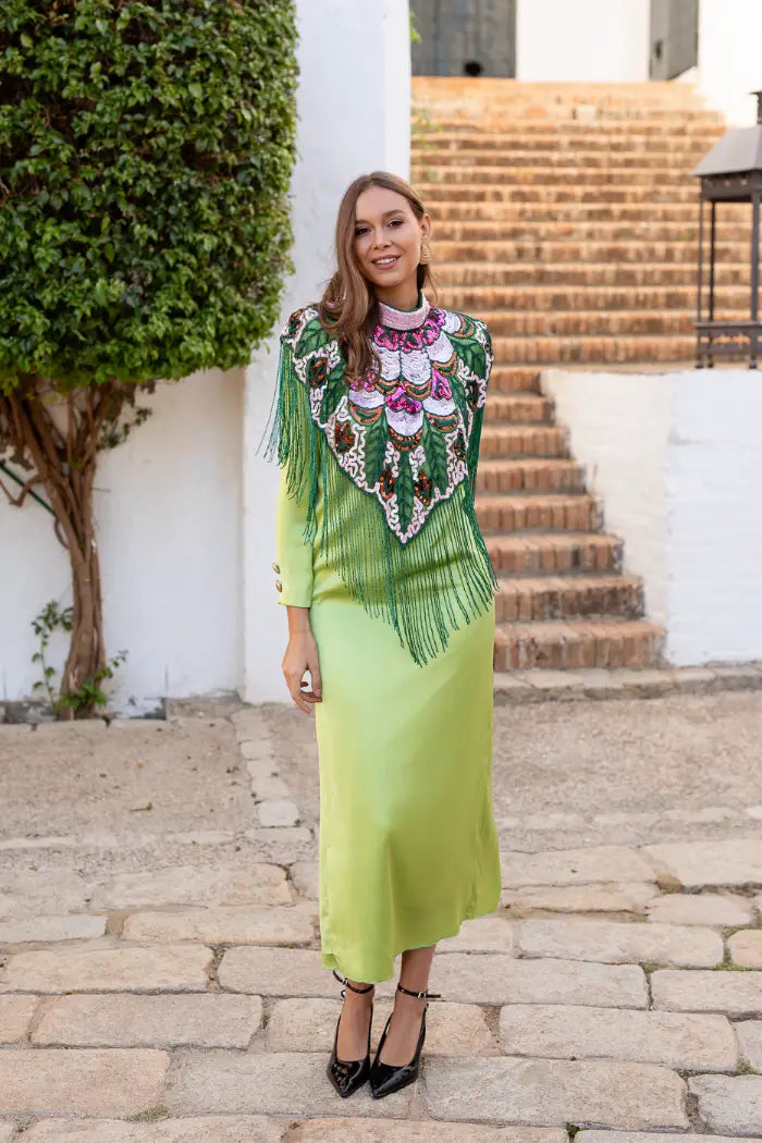 La capa joya Multi Tribal es una pieza que destaca por su diseño vibrante y contemporáneo. Su caída ligera y silueta fluida envuelven la figura con elegancia, aportando movimiento y estilo a cada gesto.