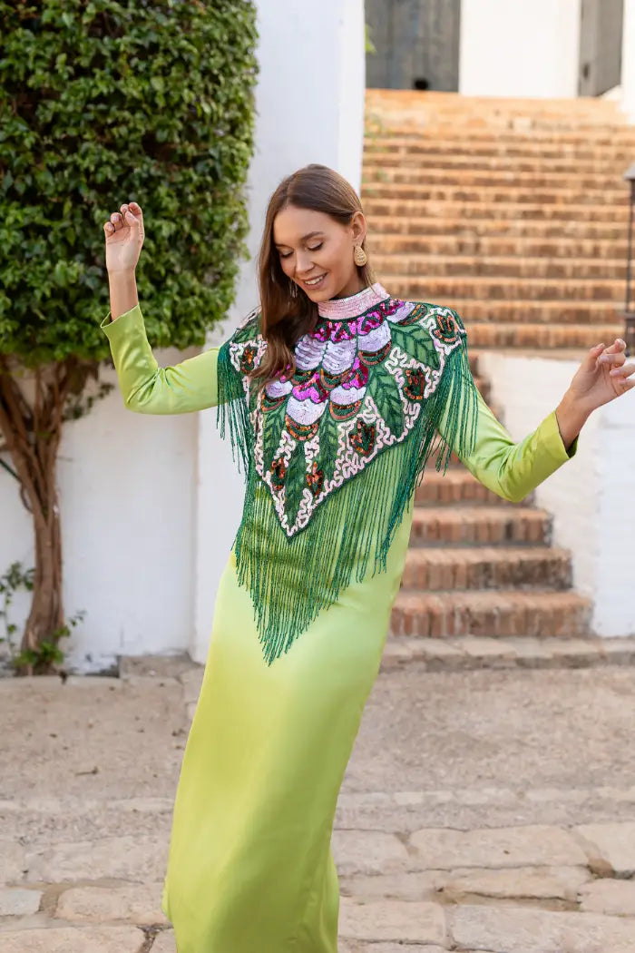 Las lentejuelas y cuentas están distribuidas formando bloques de colores curvados que recorren toda la capa, creando un efecto dinámico y llamativo que convierte la prenda en una pieza única y artística.