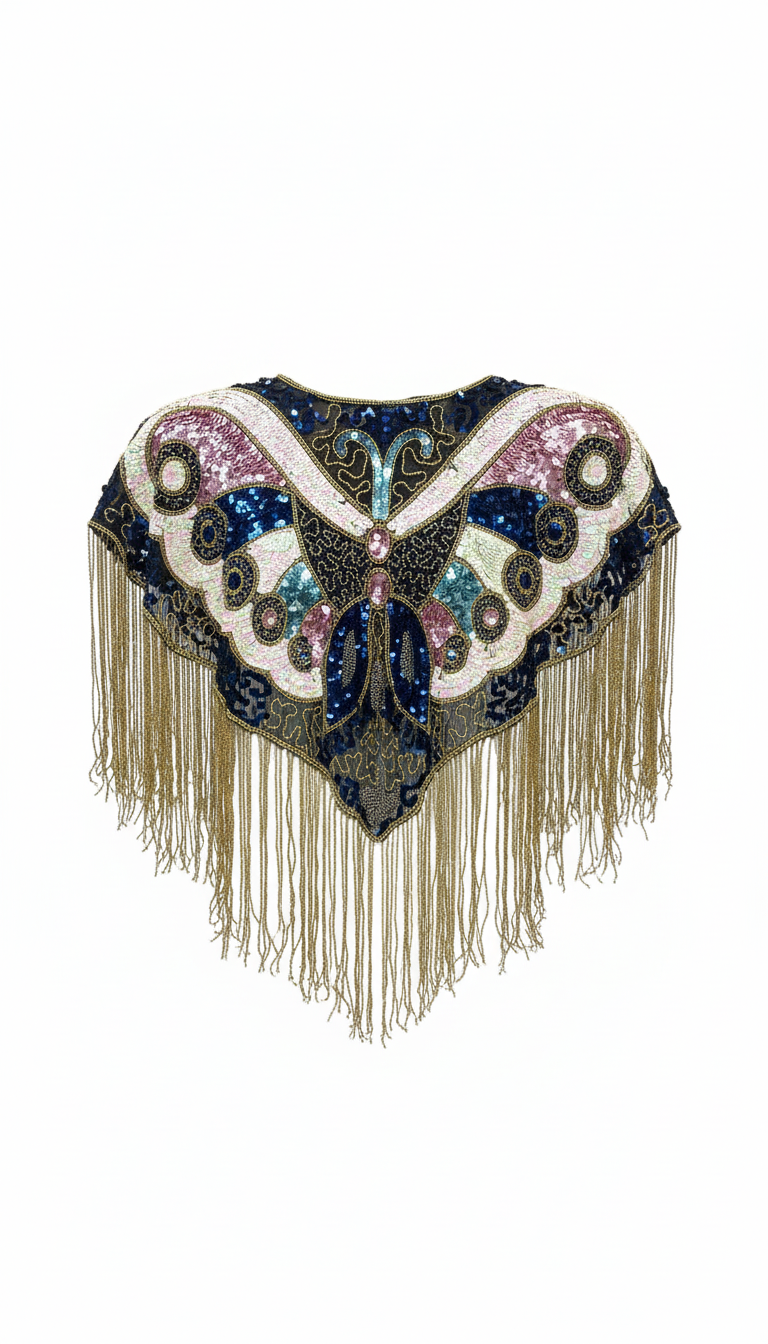 Descubre esta exclusiva capa joya elaborada artesanalmente en la India, donde cada detalle refleja un arte único y lleno de historia. Su forma semicircular, adornada con lentejuelas y patrones que recuerdan a las alas de una mariposa en vuelo, ofrece una textura rica y vibrante que envuelve suavemente al llevarla, aportando una sensación de sofisticación y movimiento. Perfecta para combinar sobre un vestido sencillo o unas prendas básicas, realza cualquier look con su elegancia y dinamismo.