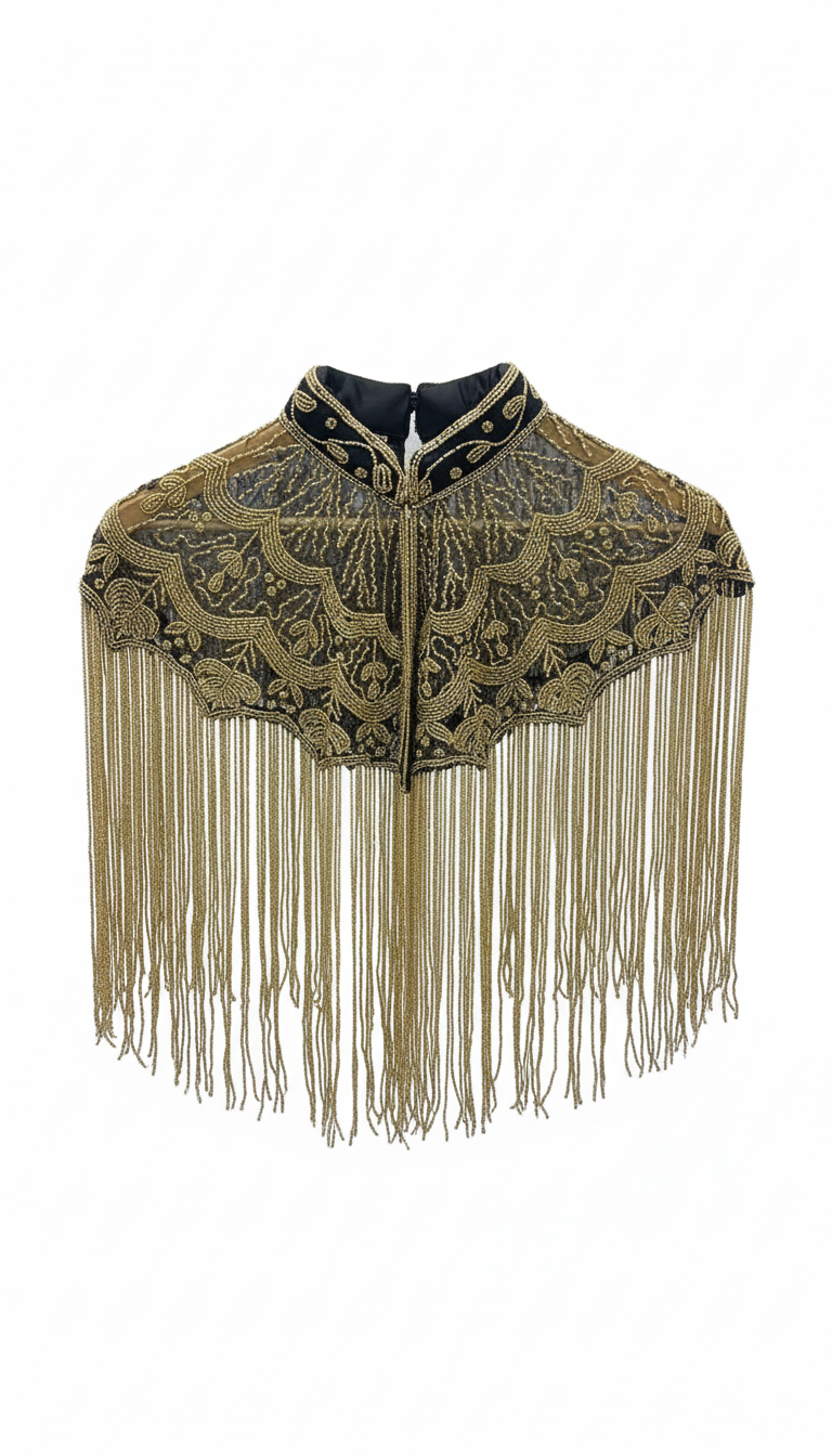 Esta capa joya es una auténtica obra artesanal de India, confeccionada con una delicada combinación de tejidos y cuentas que crean una textura única y sofisticada. Su diseño en forma de semi-círculo recuerda a las alas de un ave en pleno vuelo, enfatizando elegancia y movimiento. Llevarla es una experiencia que evoca confianza y magnetismo, transformando cualquier atuendo en una declaración de estilo y personalidad. Puedes lucirla en eventos especiales o combinarla con looks más casuales para añadir un toque de creatividad y chispa.
