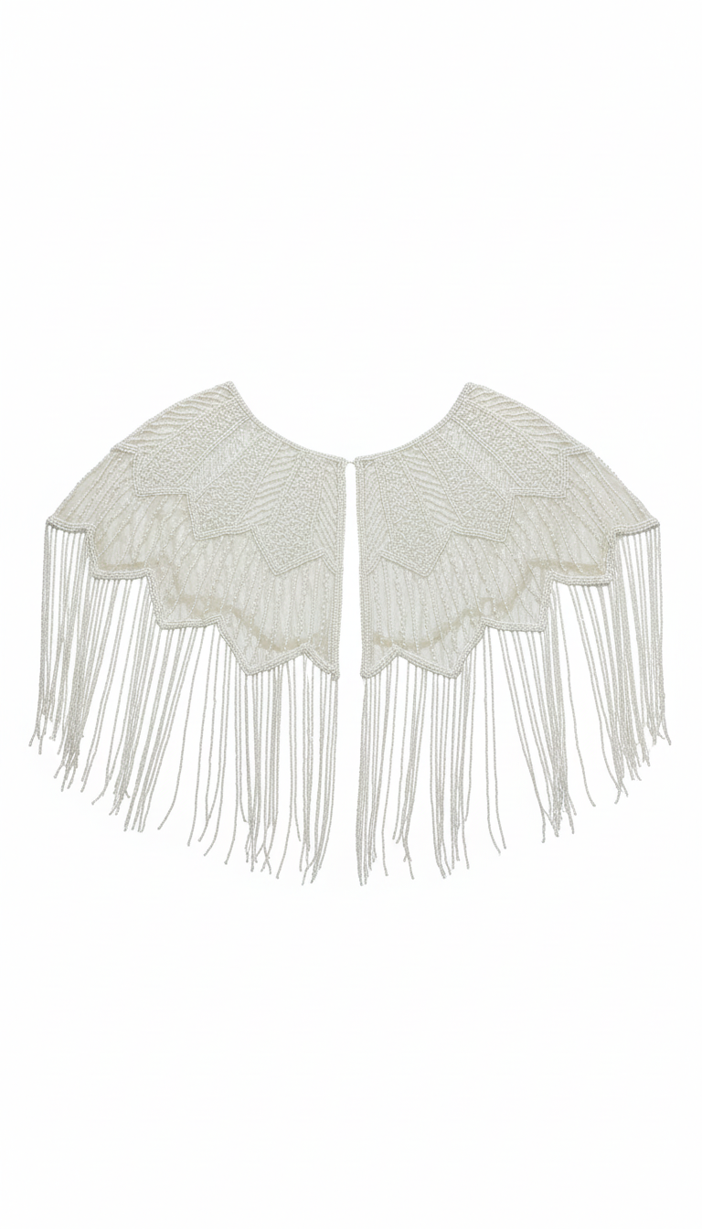 Descubre esta capa joya artesanal, hecha a mano en India con delicados abalorios que forman un diseño hexagonal que recuerda a elegantes alas desplegadas. Su textura ligera y fluida combina con la caída de sus flecos, creando un movimiento hipnótico que envuelve el cuerpo con sofisticación y dinamismo. La sensación al llevarla es de pura feminidad y estilo, perfecta para realzar cualquier look aportando un toque único y artesanal.
