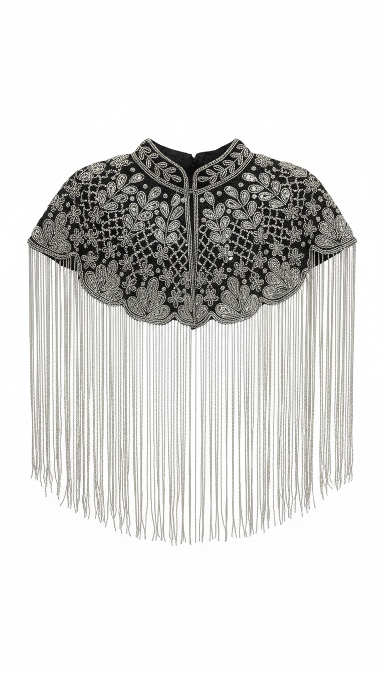 Descubre esta exclusiva capa joya, elaborada a mano en India con un trabajo artesanal que pone en valor cada detalle. Su forma delicadamente estructurada se asemeja a un capullo floral, mientras que su textura de intrincados bordados y flecos alargados transmite movimiento y elegancia con cada paso. Al llevarla, sientes un aire de sofisticación y un toque de misterio que realza cualquier look, perfecta para combinar tanto en eventos especiales como para aportar un toque único a tu estilo diario.