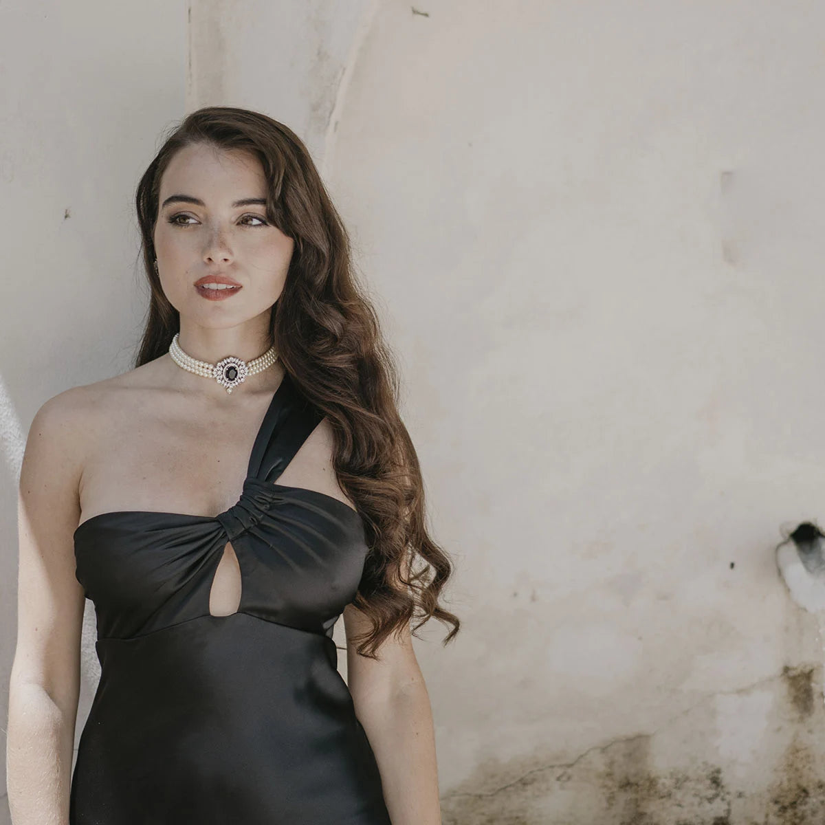 Choker deslumbrante compuesto por tres hileras de piedras, que abrazan delicadamente el cuello con un toque de sofisticación. En el centro, una pieza ovalada resplandece, diseñada a conjunto con los elegantes pendientes Cilla, creando una armonía perfecta entre ambos accesorios.