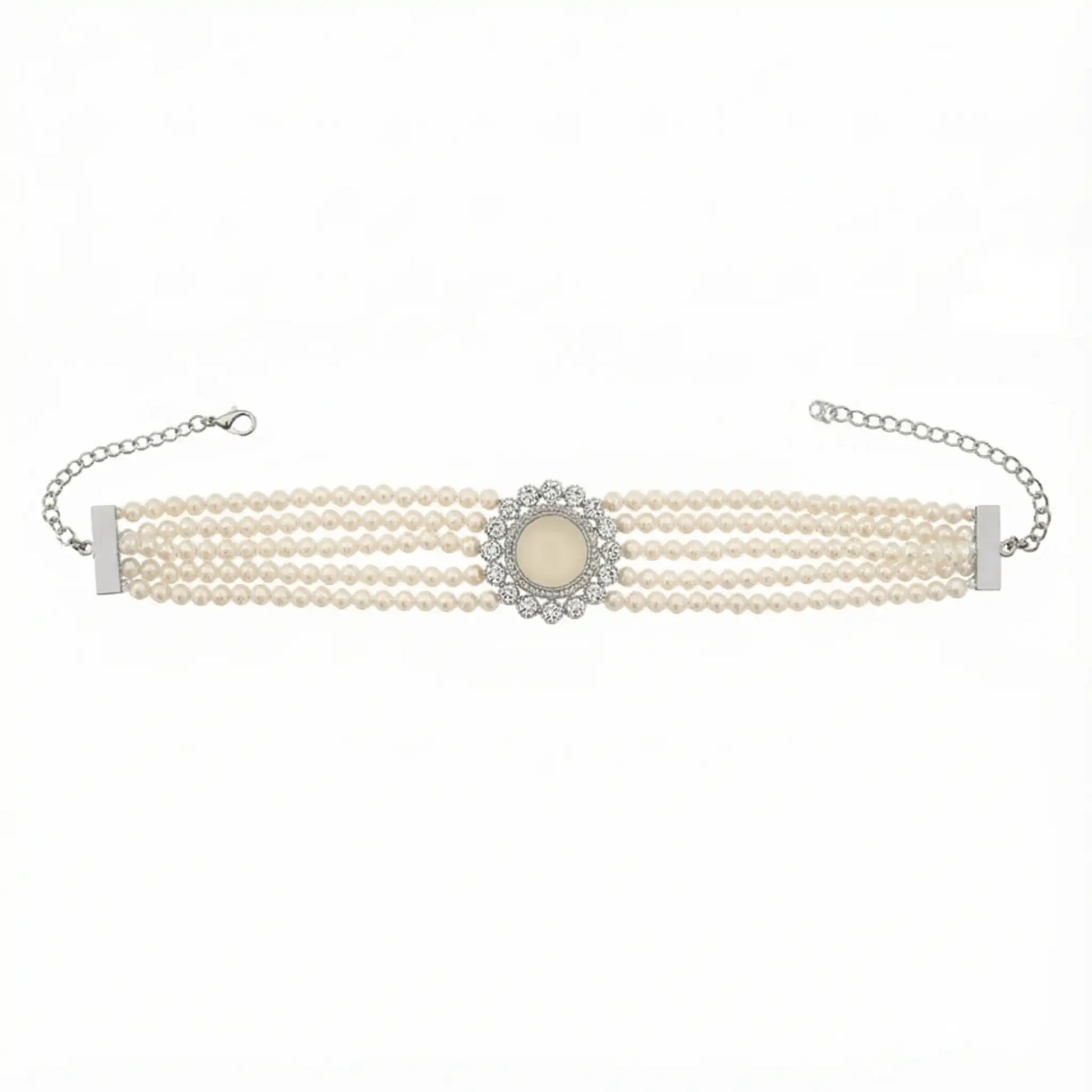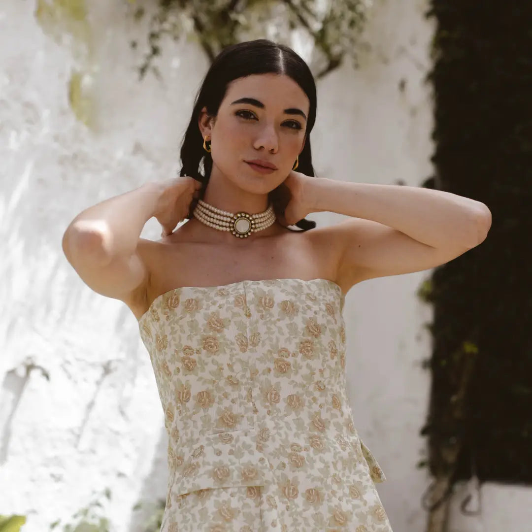 Una joya con alma de otro tiempo, creada para realzar tu elegancia natural. Este choker combina cuatro hileras de perlas que abrazan el cuello con delicadeza y una pieza central redonda que recuerda a los camafeos clásicos, rodeada de detalles en dorado que aportan un aire sofisticado y cálido.