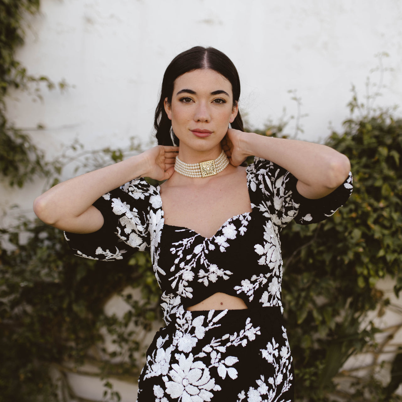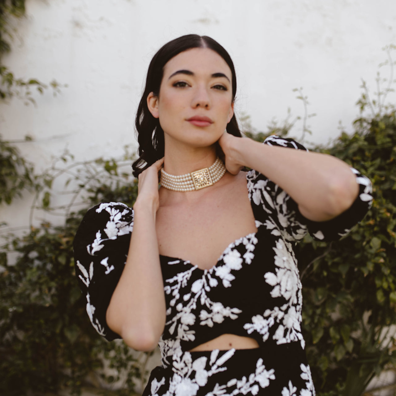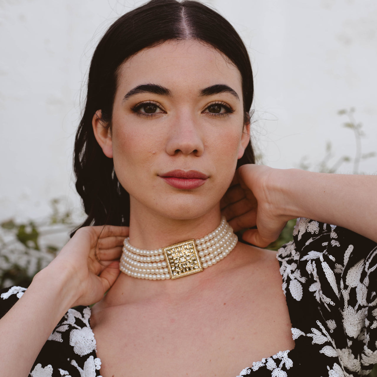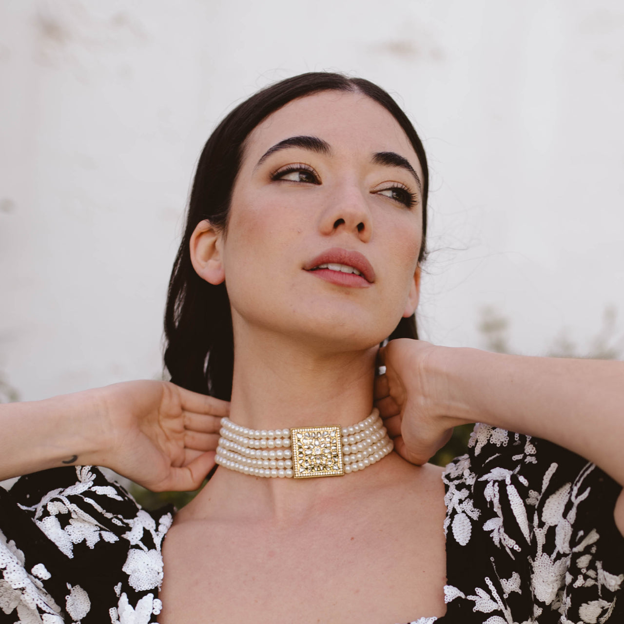 Un diseño que rinde homenaje a la majestuosidad de la joyería clásica con un toque contemporáneo irresistible. El choker Liora está compuesto por cinco hileras de perlas perfectamente alineadas que abrazan el cuello con elegancia, culminando en un espectacular broche cuadrado con relieves ornamentales que evocan piezas de museo.