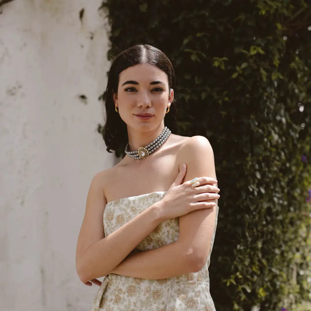 Un diseño con personalidad propia, que combina elegancia clásica con un aire contemporáneo. El choker Zaria está compuesto por hileras de perlas gris metálico que abrazan el cuello con fuerza y estilo. En el centro, una pieza ornamentada con una piedra lágrima resplandeciente rodeada de pequeños detalles dorados que capturan la luz en cada movimiento.