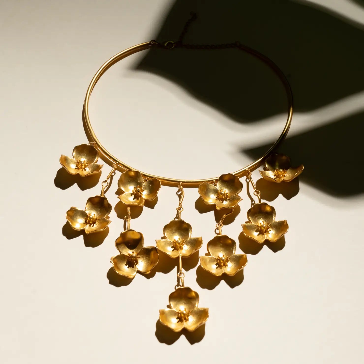 Miria es un diseño que convierte la flor de Florina en un juego de movimiento y luz. Sobre una estructura rígida y pulida, las flores caen en distintos niveles, creando un efecto de cascada que enmarca el cuello y aporta una presencia artística y muy especial.