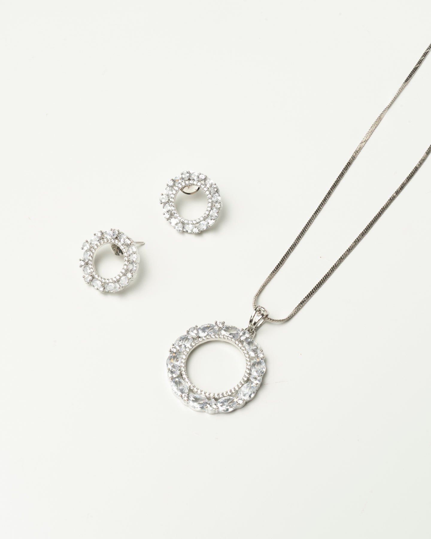 Un conjunto de colgante y pendientes con forma de circunferencia plana, que transmite elegancia y simplicidad. Su diseño minimalista aporta un toque moderno y sofisticado, realzando cualquier look con estilo y delicadeza.