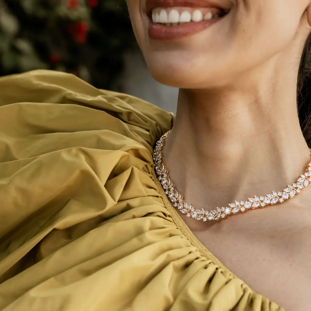 Este conjunto de collar y pendientes ha sido diseñado para aportar luminosidad y sofisticación de forma armoniosa. Sus formas cuidadas y su acabado brillante crean un efecto elegante que realza el conjunto del look con sutileza y distinción.