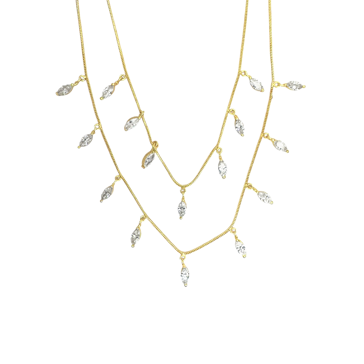 El Collar Brisalia evoca el brillo sutil del rocío suspendido en el aire. Compuesto por una doble cadena fina y elegante, de la que cuelgan pequeñas gotas en forma de circonitas engastadas en corte marquesa, este diseño transmite ligereza, sofisticación y movimiento. Perfecto para combinar con los pendientes Abril y cualquiera de la colección brillo.