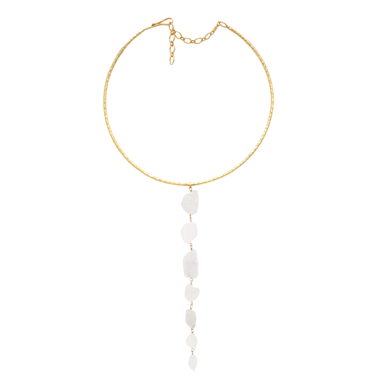 Original y elegante collar con varias piedras móviles que descienden desde la pieza central.