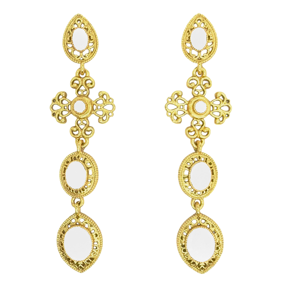 Un diseño que combina sofisticación y detalle artesanal. Estos pendientes largos destacan por sus piedras finamente enmarcadas, comenzando con una piedra principal que da paso a una cruz elaborada con una piedra en el centro. Bajo ella, una elegante secuencia de piedras perfectamente enmarcadas culmina en una pieza más grande que realza su presencia. Un accesorio pensado para quienes buscan destacar con un estilo único y atemporal.