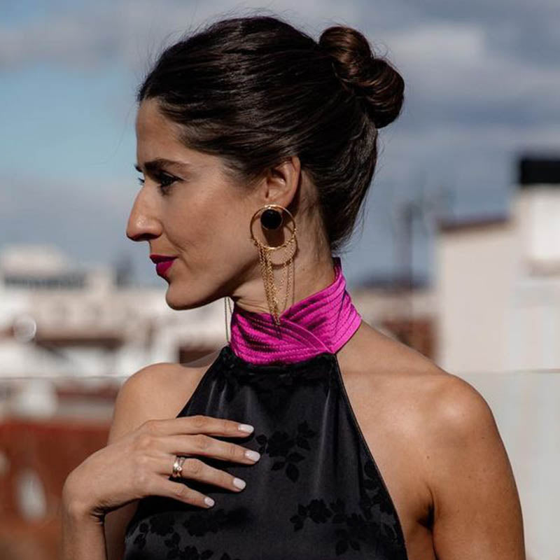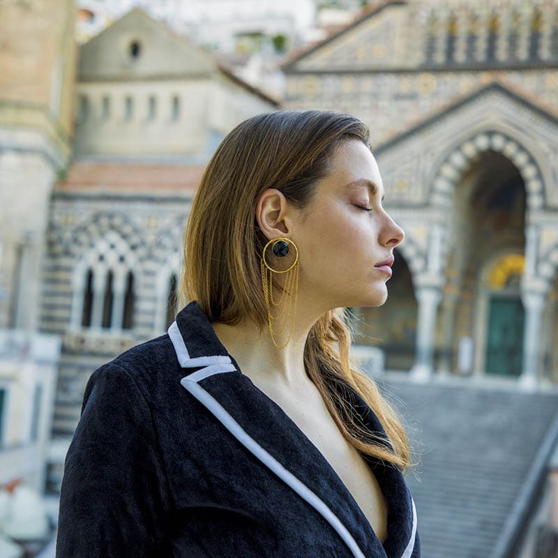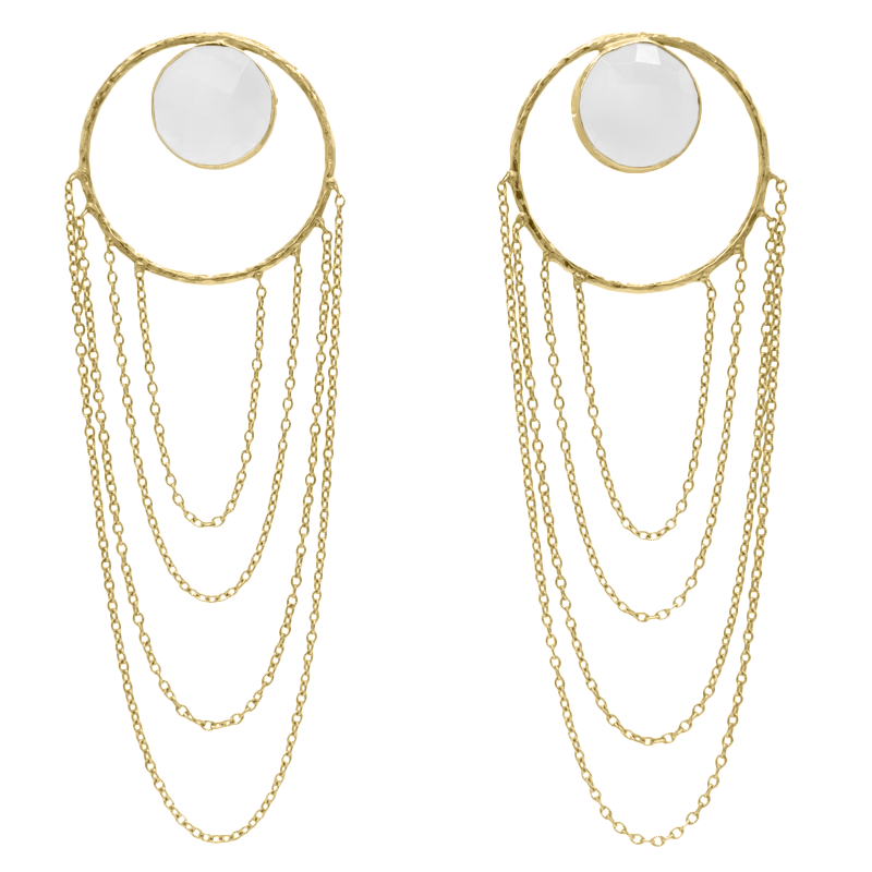 Modernos y elegantes, estos pendientes destacan por su piedra circular y cadenas colgantes. También disponible en una versión más pequeña: Simbel Small. Añade un toque de estilo distintivo a tu look.