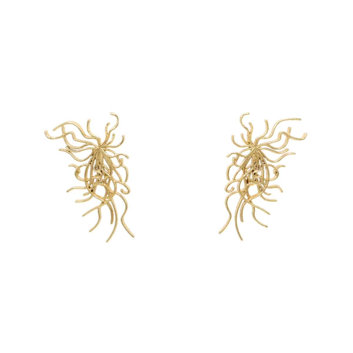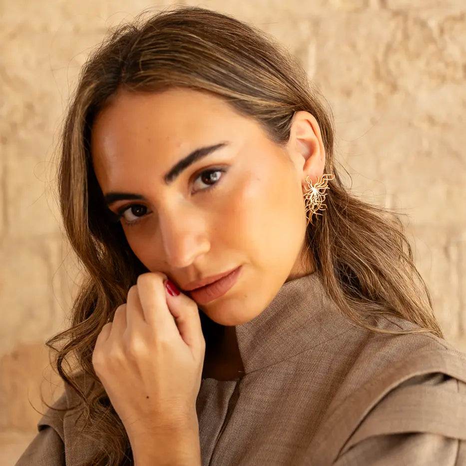 Este pendiente destaca por su forma llena de dinamismo: líneas orgánicas que se entrelazan y crean una silueta fluida, casi escultórica. Su diseño aporta un efecto de movimiento que ilumina el rostro y añade un toque artístico sin dejar de ser elegante.