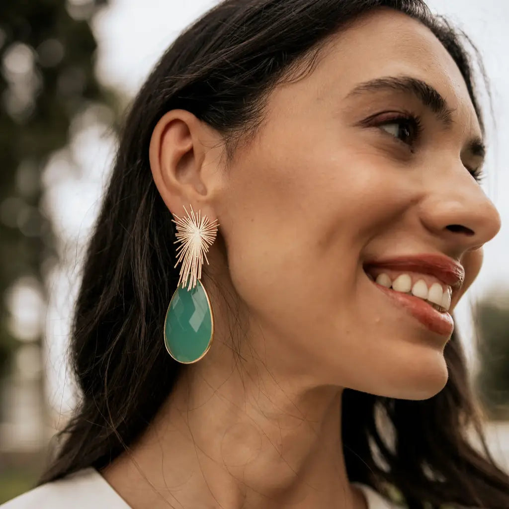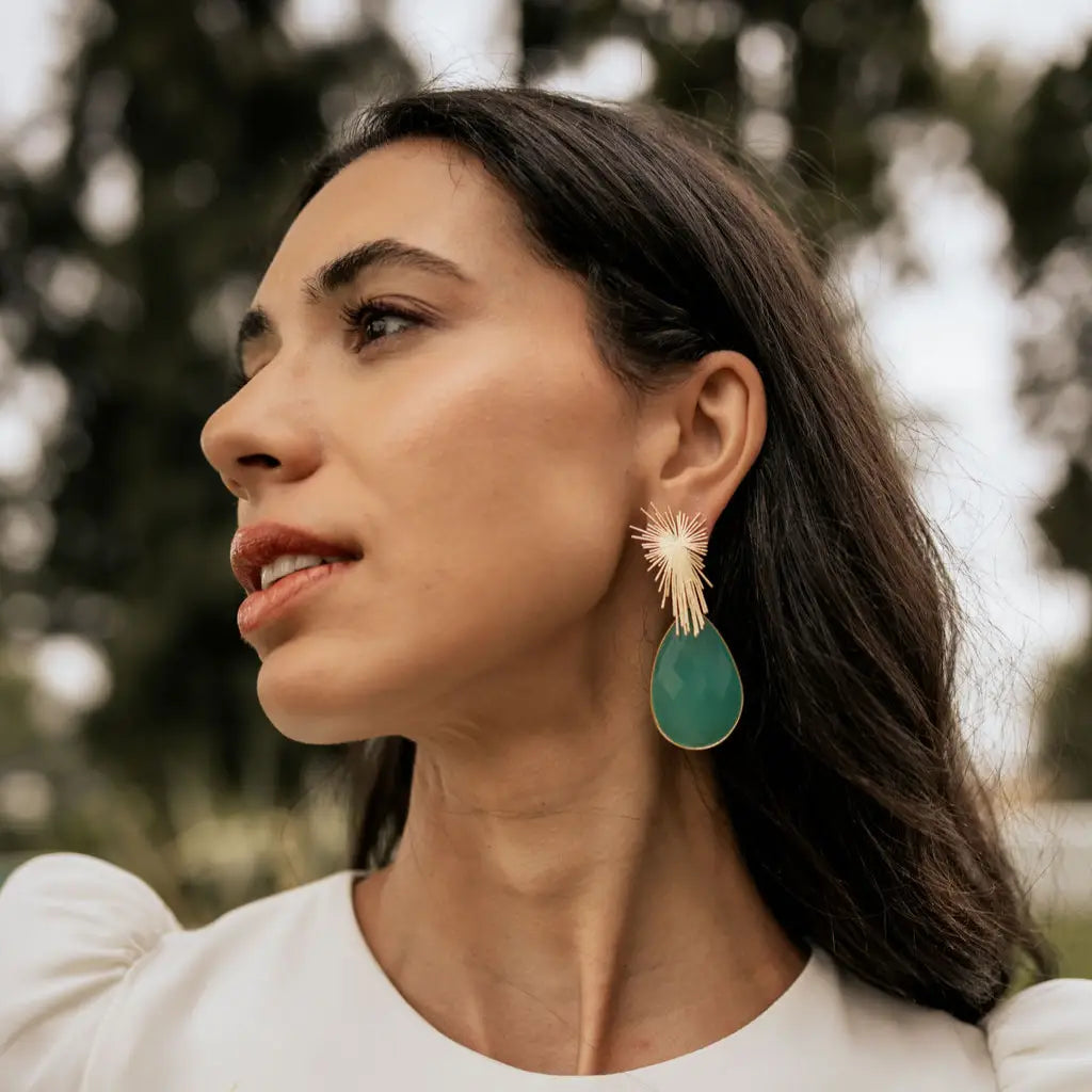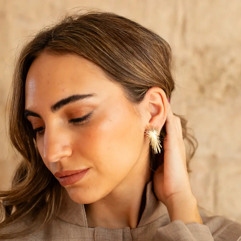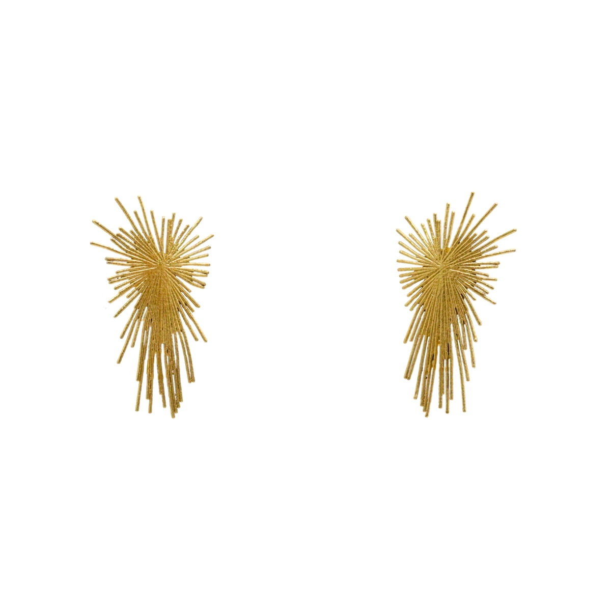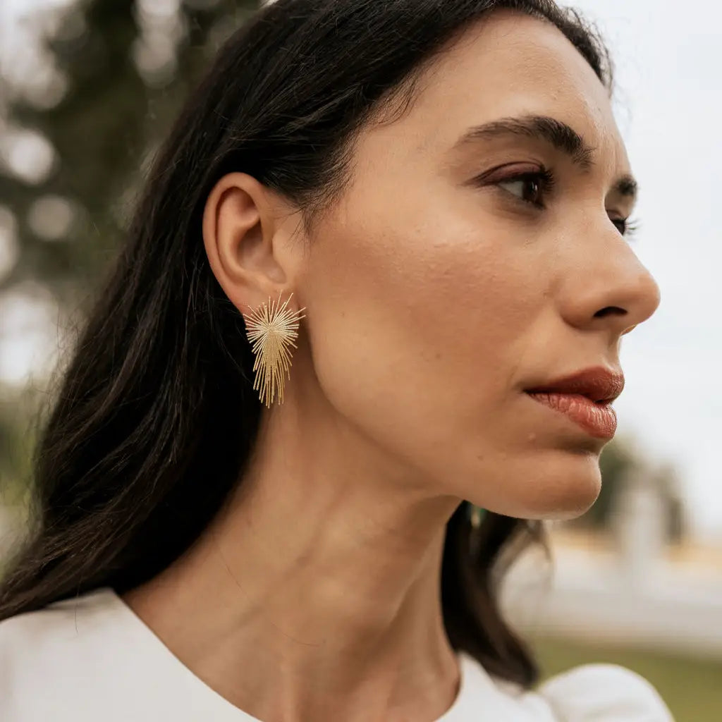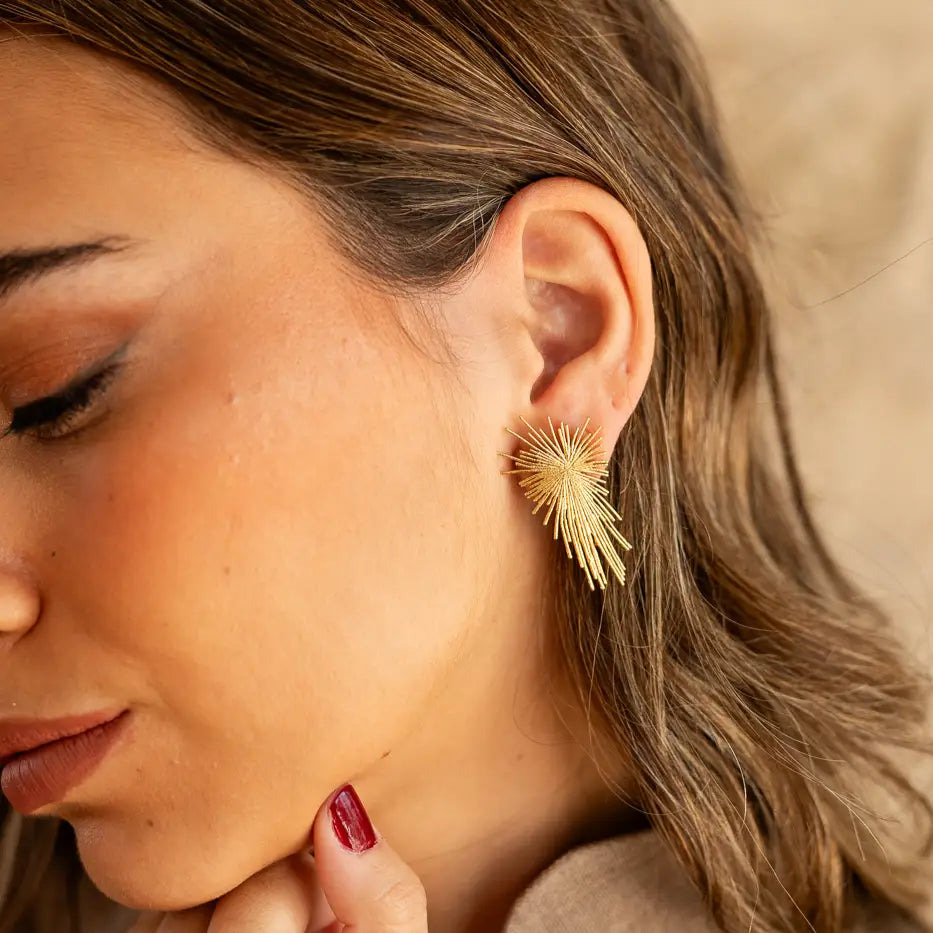 Estos pendientes se destacan por su diseño audaz y su forma explosiva, con un conjunto de líneas radiales que evocan un brillante destello de luz. La textura dorada y la disposición asimétrica de las piezas ofrecen un equilibrio perfecto entre modernidad y sofisticación, creando un efecto visual vibrante y lleno de energía. Su diseño, inspirado en la estética contemporánea, aporta un toque único a cualquier atuendo.