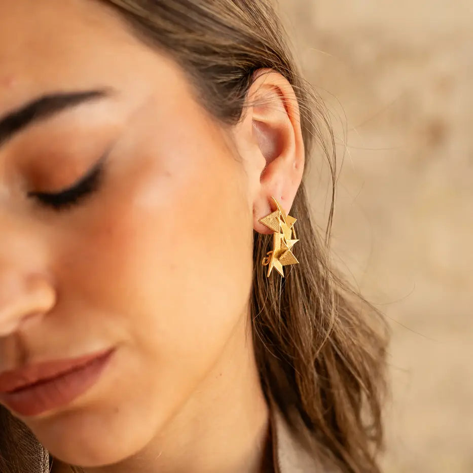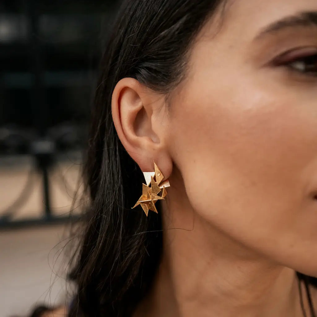 Estos pendientes combinan una serie de figuras geométricas en dorado, creando una estructura compleja y dinámica que captura la luz de manera impactante. Su diseño, inspirado en el arte moderno y la geometría abstracta, tiene un aire vanguardista que aporta un toque de sofisticación y originalidad a cualquier look. La mezcla de texturas metálicas resalta la profundidad y el contraste de la pieza, haciendo que cada ángulo ofrezca una nueva perspectiva.