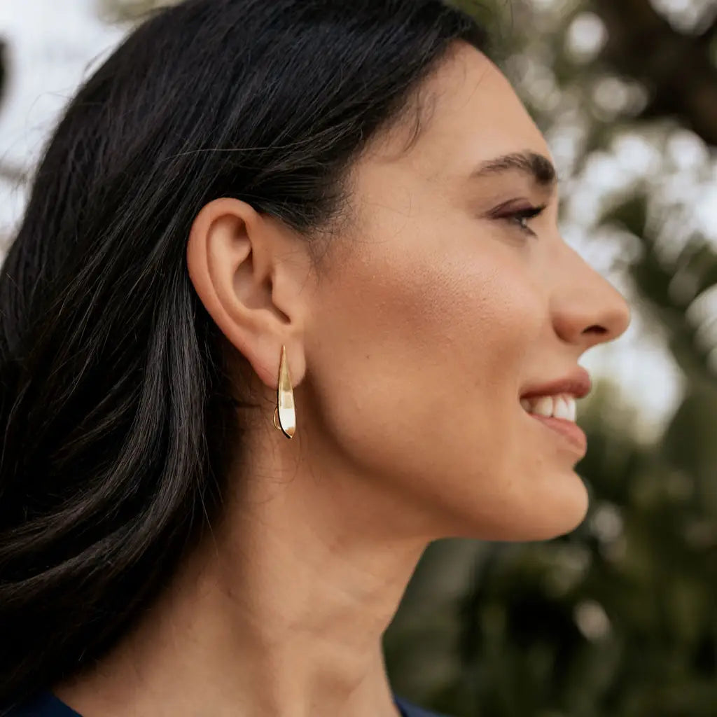 Estos pendientes destacan por su forma alargada y estilizada, que recuerda a un trazo fluido dibujado en oro. Su silueta fina y pulida crea una presencia sutil pero muy refinada, aportando un brillo suave que acompaña el movimiento con delicadeza. Son piezas que celebran la pureza de las líneas y la belleza de lo simple.