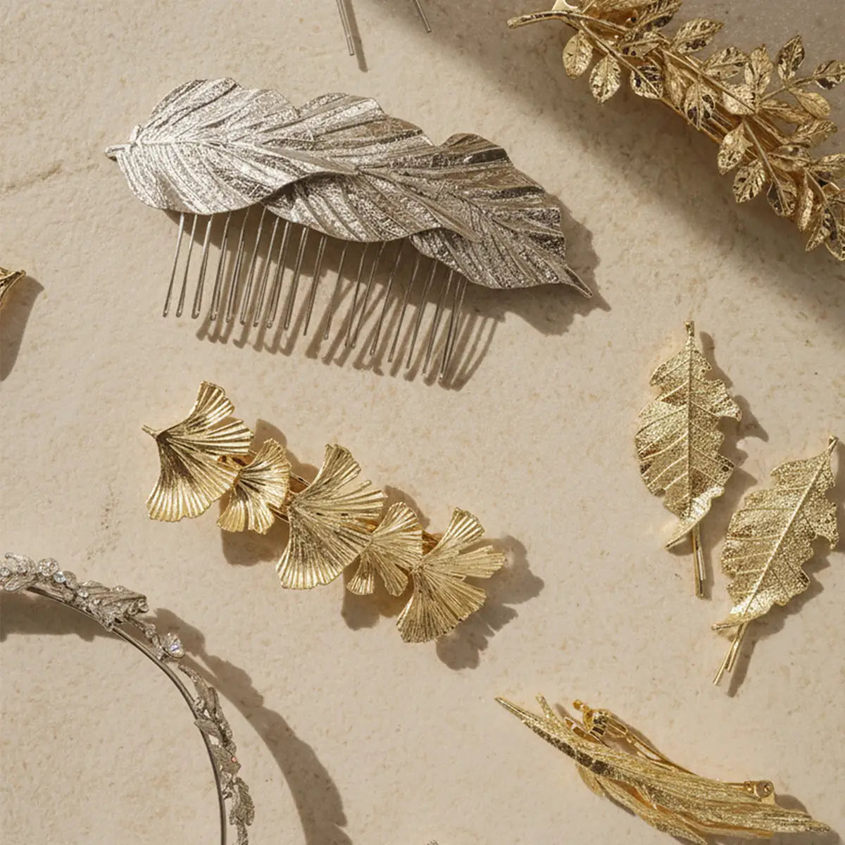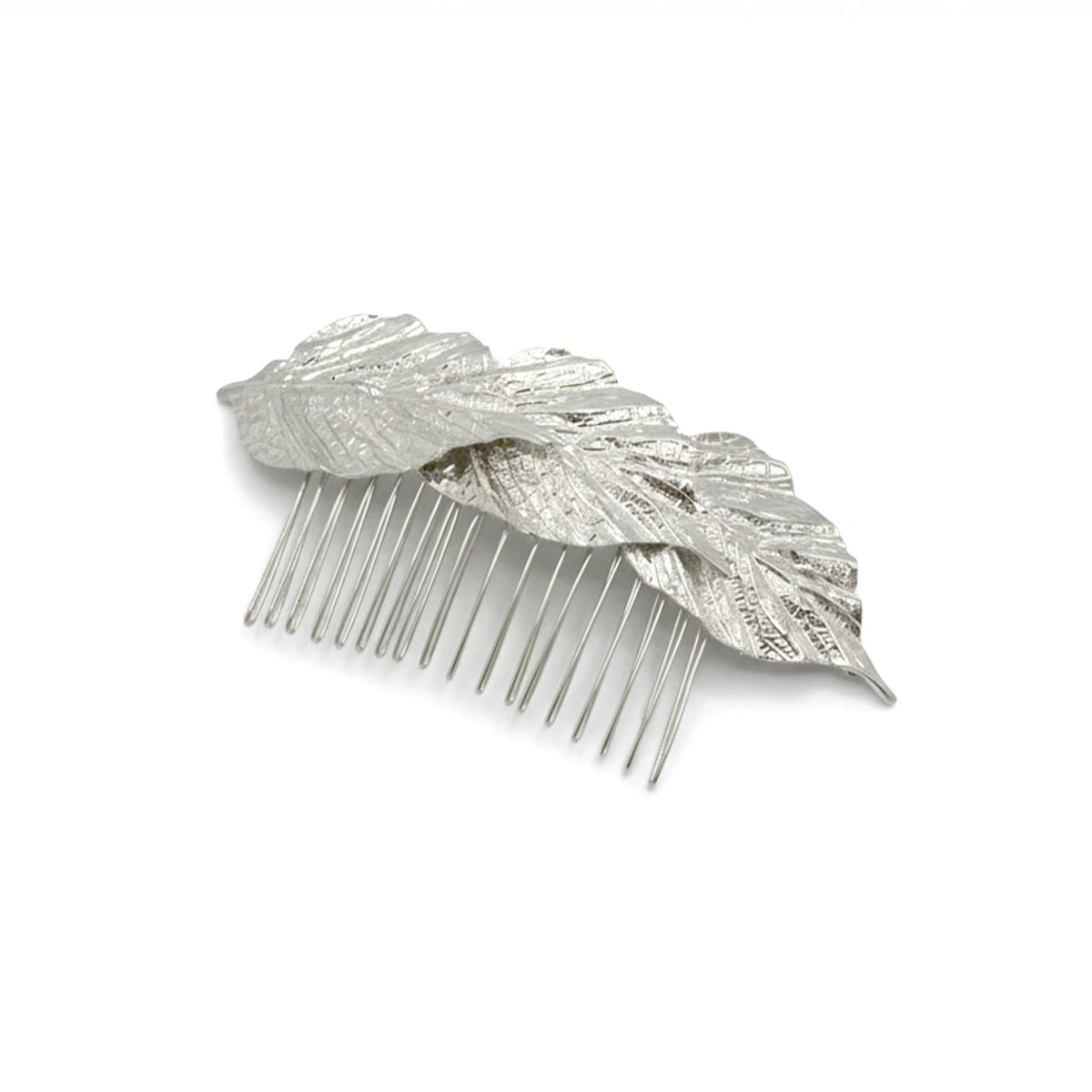 Esta peineta destaca por su diseño inspirado en la naturaleza, con tres hojas anchas que se suceden suavemente una tras otra, como si el viento las hubiese posado sobre tu cabello. La ligera superposición entre ellas crea un efecto de movimiento y profundidad que aporta un encanto sereno y atemporal.