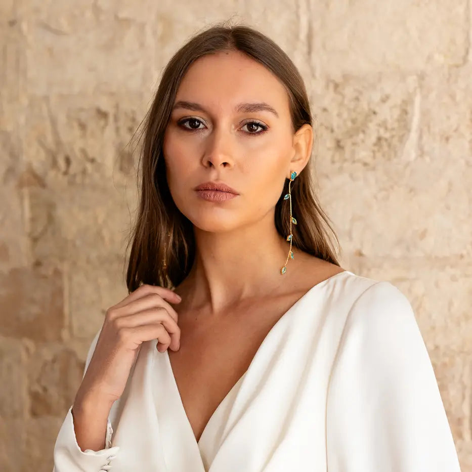 ¡Explora la exquisita elegancia con nuestros pendientes largos adornados con pequeñas hojas ovaladas! Delicadamente móviles y versátiles, estos pendientes añaden un toque de sofisticación a cualquier conjunto. Con su encanto incomparable, te enamorarán al instante y serán los pendientes imprescindibles en tu colección. ¡Hazte con ellos y deslumbra en cada ocasión!