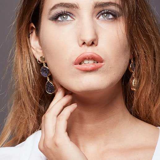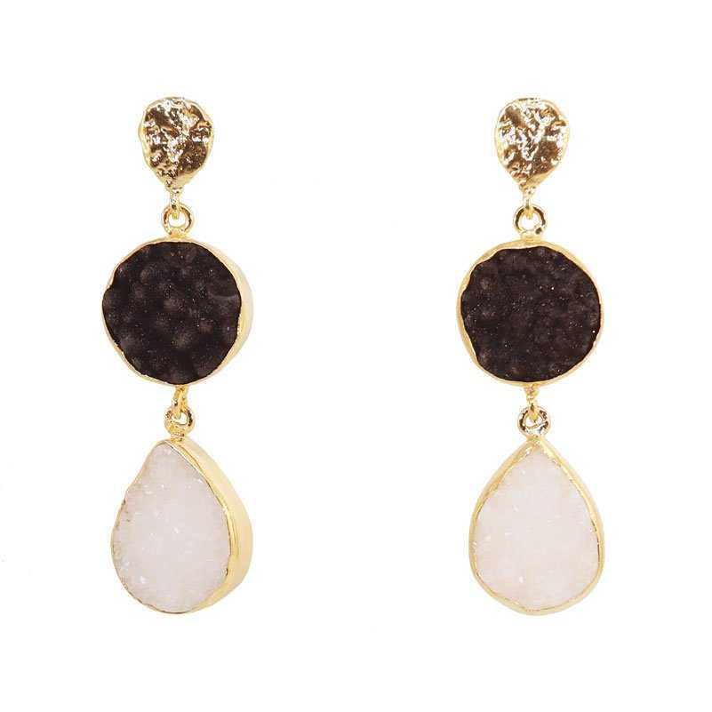 Pendientes de dos piedras: una circular y una en forma de gota con un enganche en la parte de arriba que va directo a tu oreja.