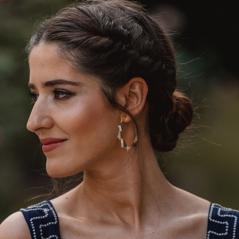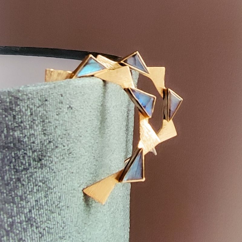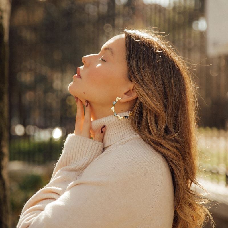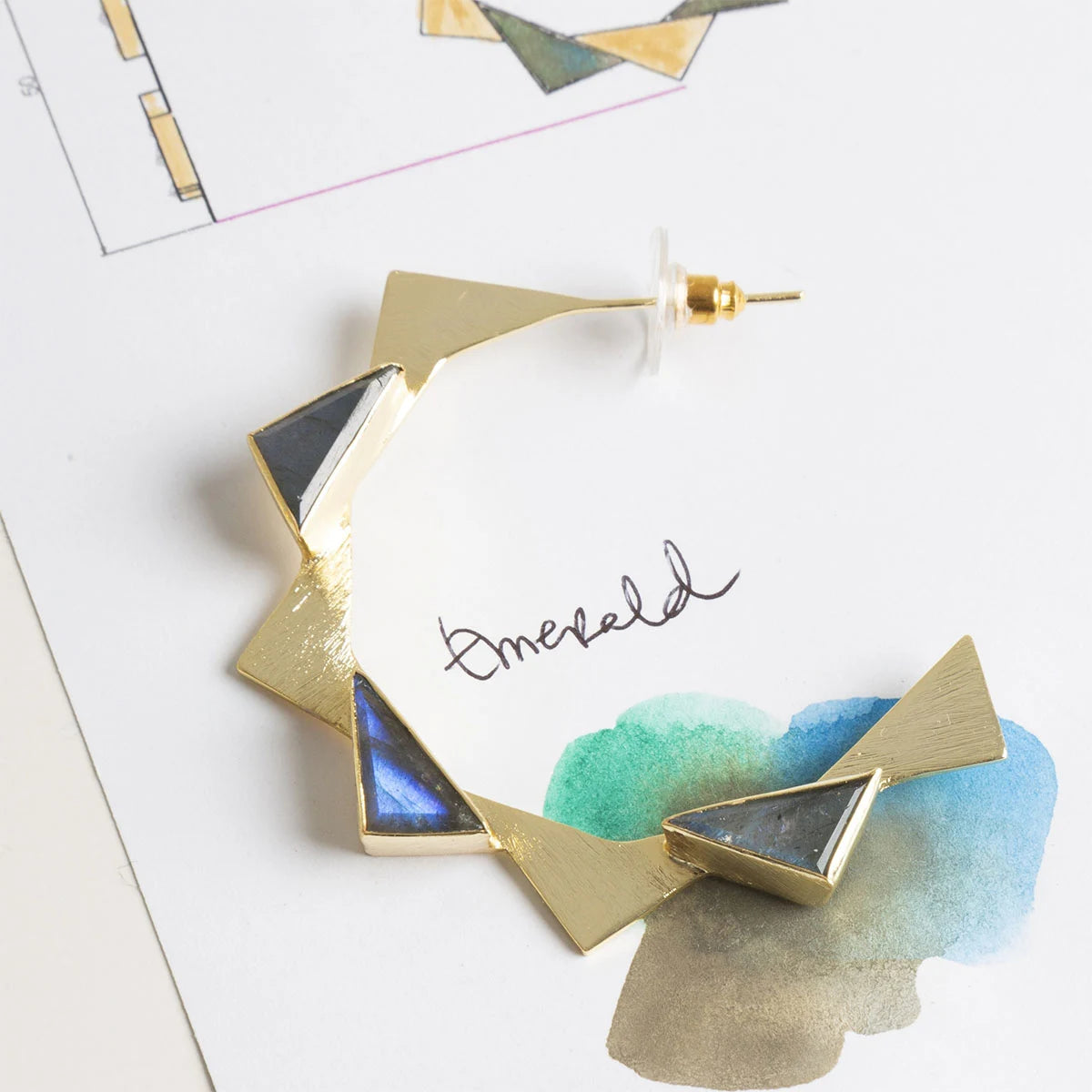 Pendientes dorados en formato aro plano. Van alternándose pequeños triángulos de piedra con otros metalicos. Un modelo muy original y vistoso a la par que cómodo; perfecto tanto para tus looks de diario a los que quieras dar un toque especial y colorido como para aquellos looks de invitada a los que quieras aportar un toque moderno y diferente