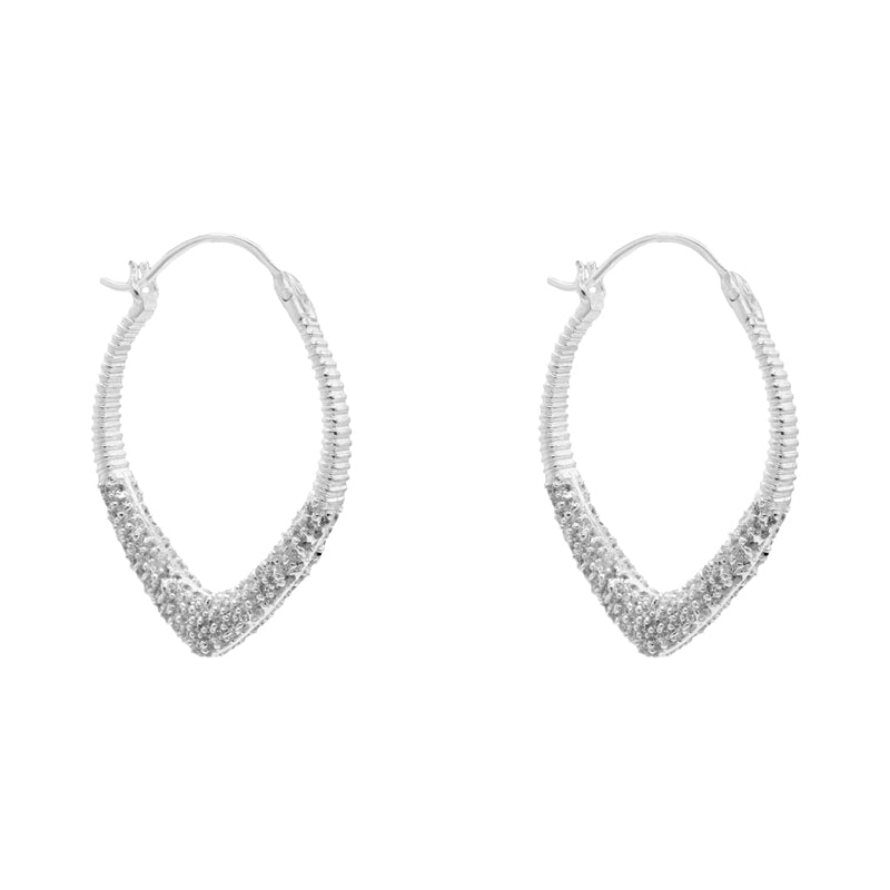 Pendientes en forma de argolla que terminan en pico. Están formados por dos texturas: una con líneas horizontales y su parte inferior con circonitas incrustadas. Un modelo de corte super actual perfecto si quieres romper con las lineas clásicas de tus looks más especiales de invitada o para eventos. Atrévete con ellos también para looks más informales y aporta un toque de luz y brillo que no pasará desapercibido.