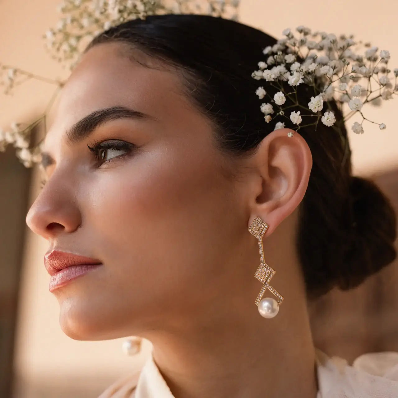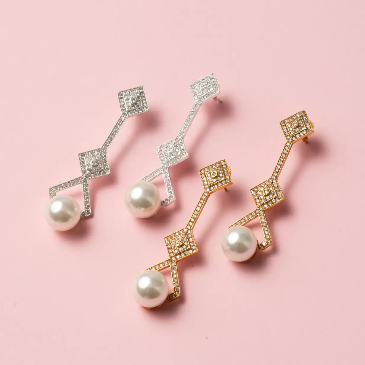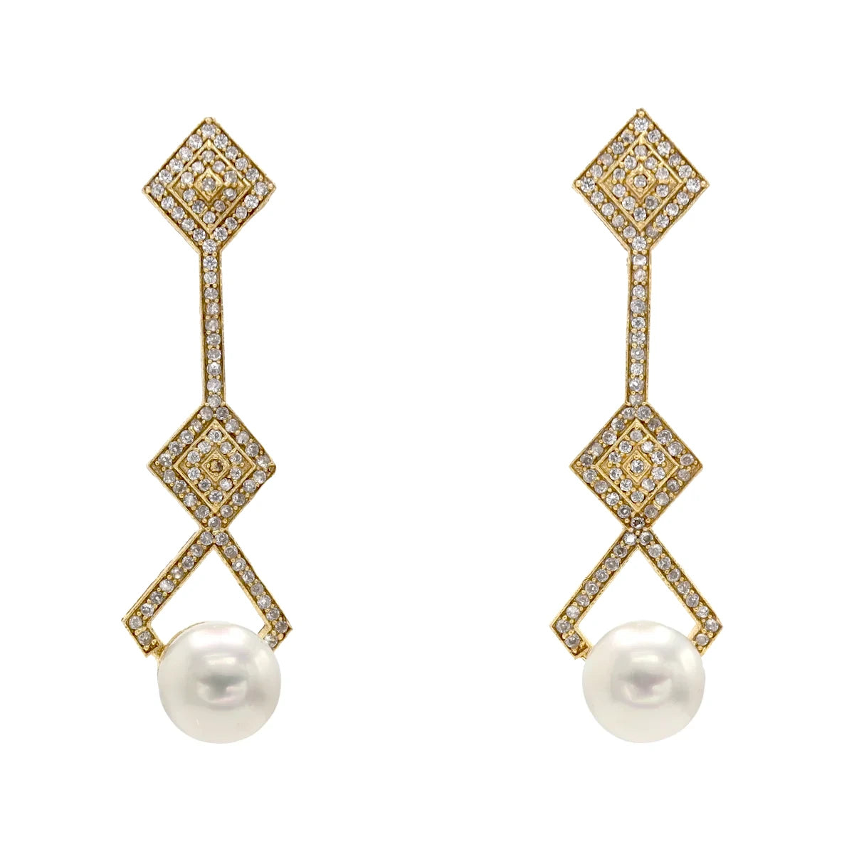Inspirados en el glamour del Art Déco, estos pendientes son una joya con presencia, diseño y mucha personalidad. El juego geométrico de rombos dorados con incrustaciones aporta un brillo sofisticado que atrapa la luz en cada movimiento. Rematados con una perla de formas suaves, equilibran el diseño con un toque clásico y atemporal.