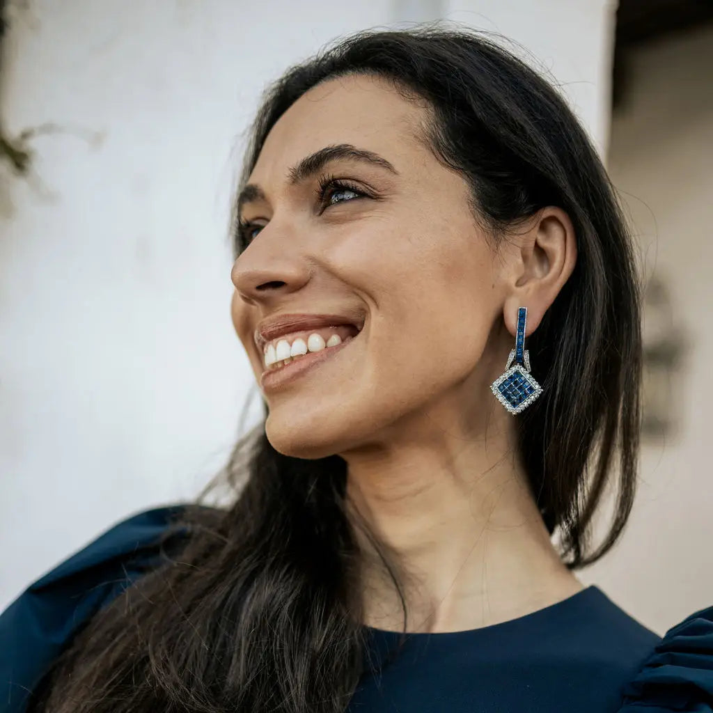 Estos pendientes presentan una línea vertical de circonitas que desciende con delicadeza hasta un rombo colgante también adornado con brillo. El contraste entre la línea recta y la forma geométrica aporta un equilibrio perfecto entre minimalismo y sofisticación, creando un efecto luminoso que acompaña cada movimiento.