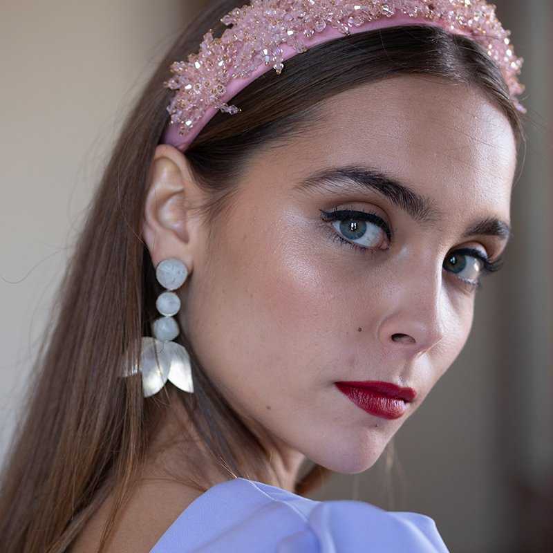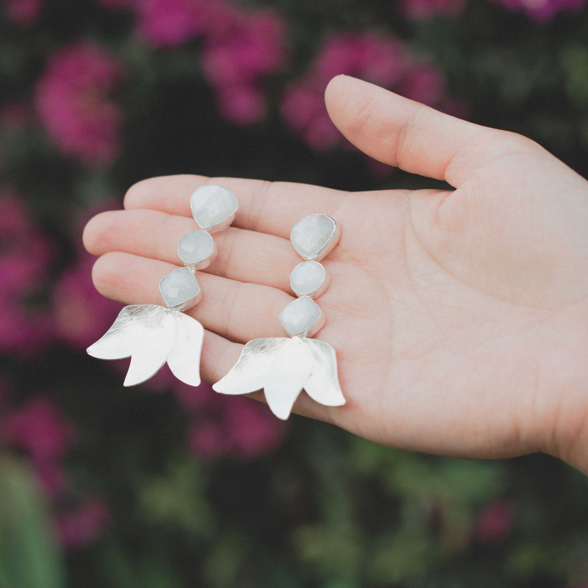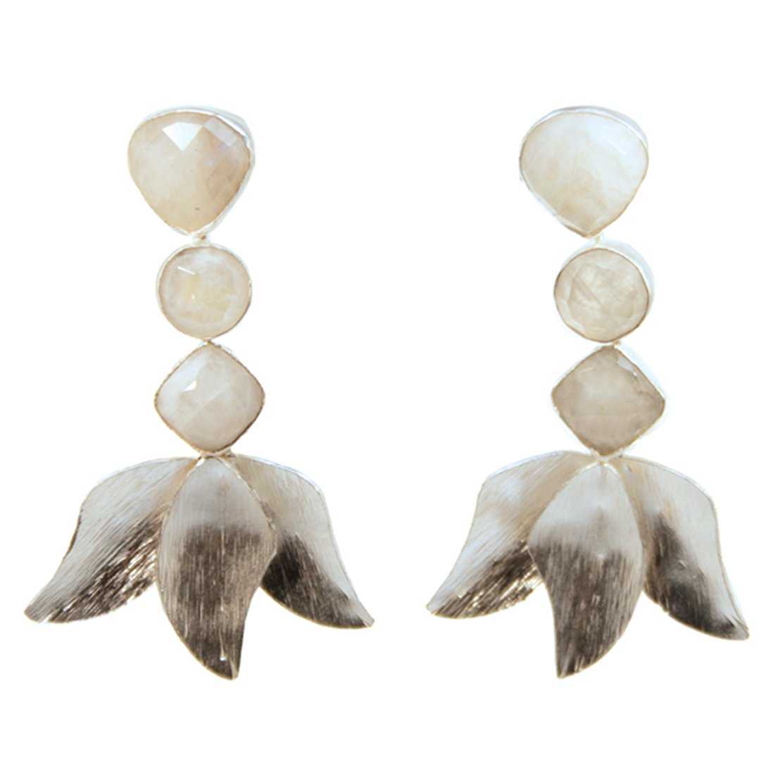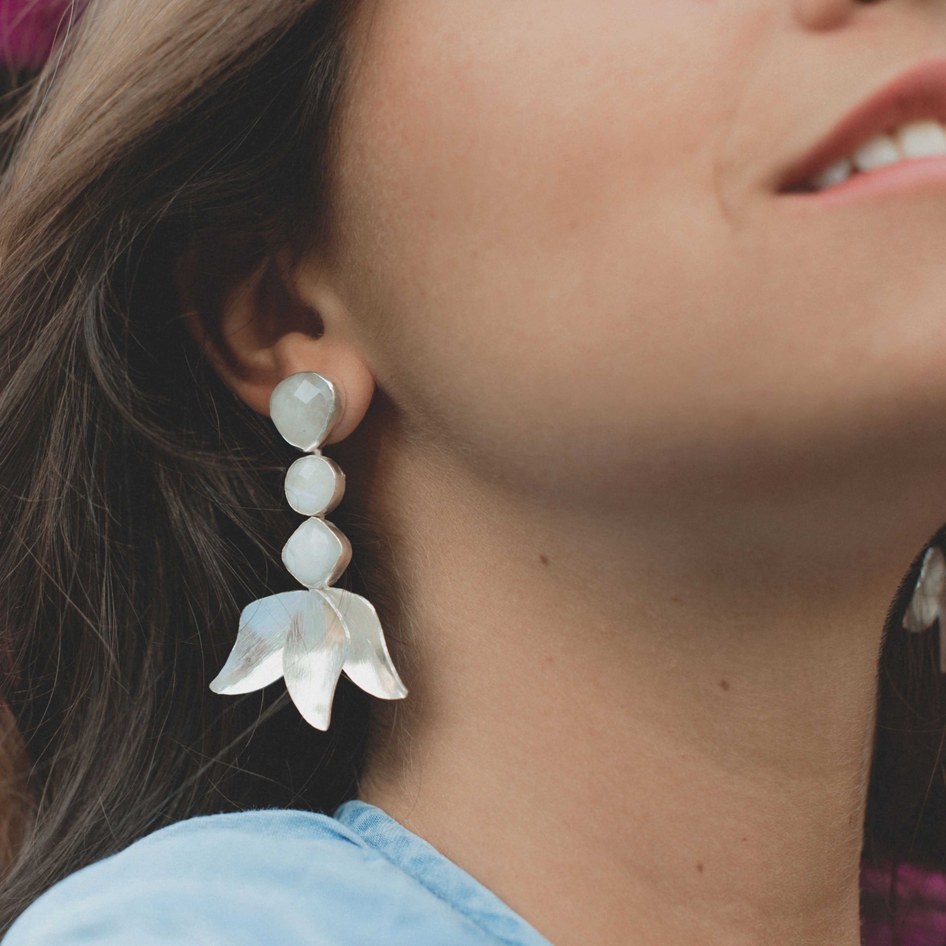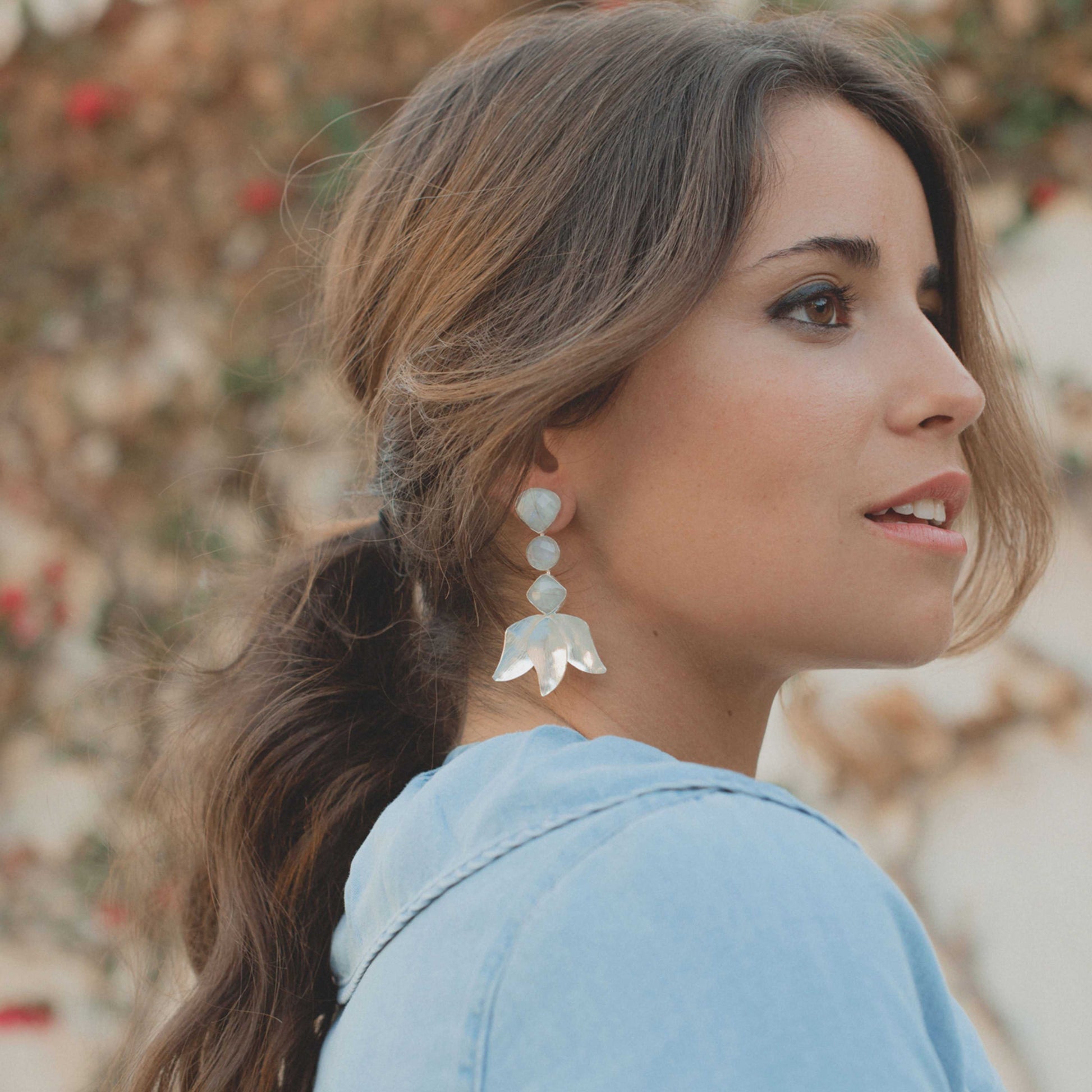 Originales y elegantes pendientes con tres piedras alineadas donde una de ellas recoge tres hojas artesanales. Favorecen por el brillo de las hojas y dan un punto diferente y distinguido al estilismo. Con ellos aciertas seguro.