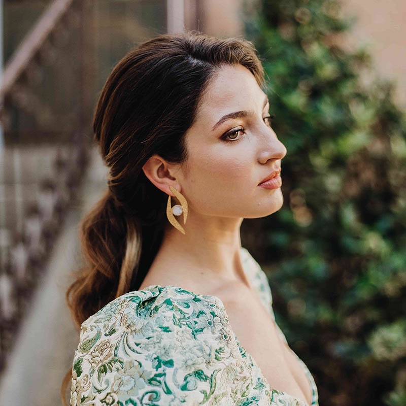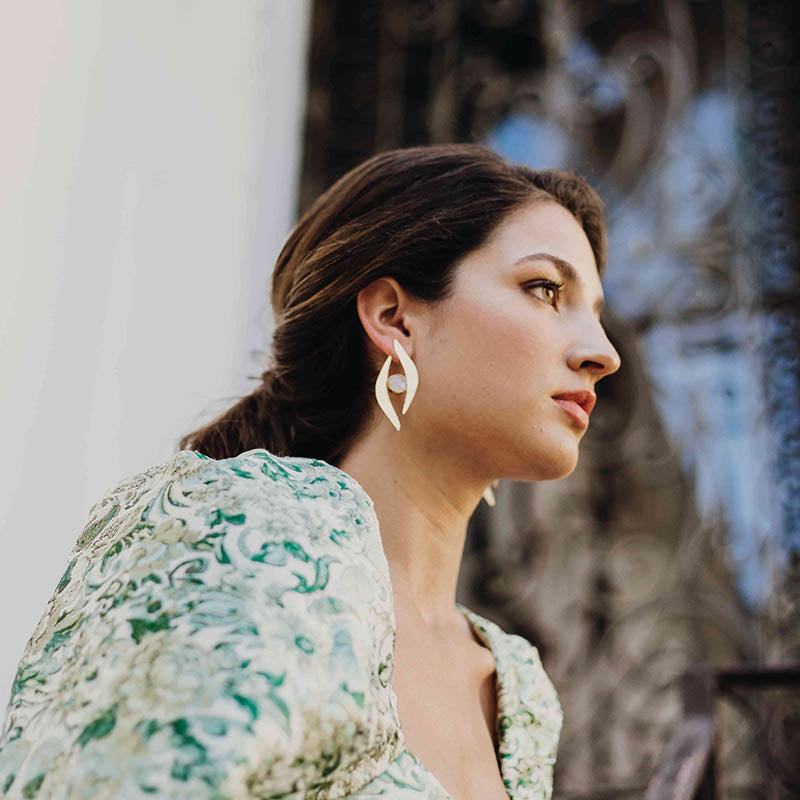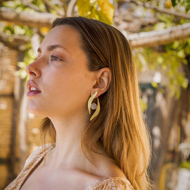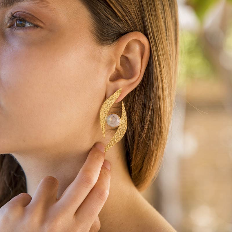Pendientes originales que adoptan una forma de curva, destacando con una piedra en el centro. Este diseño fusiona la originalidad de la forma con la luminosidad de la piedra, creando una pieza que resalta por su elegancia y estilo distintivo.