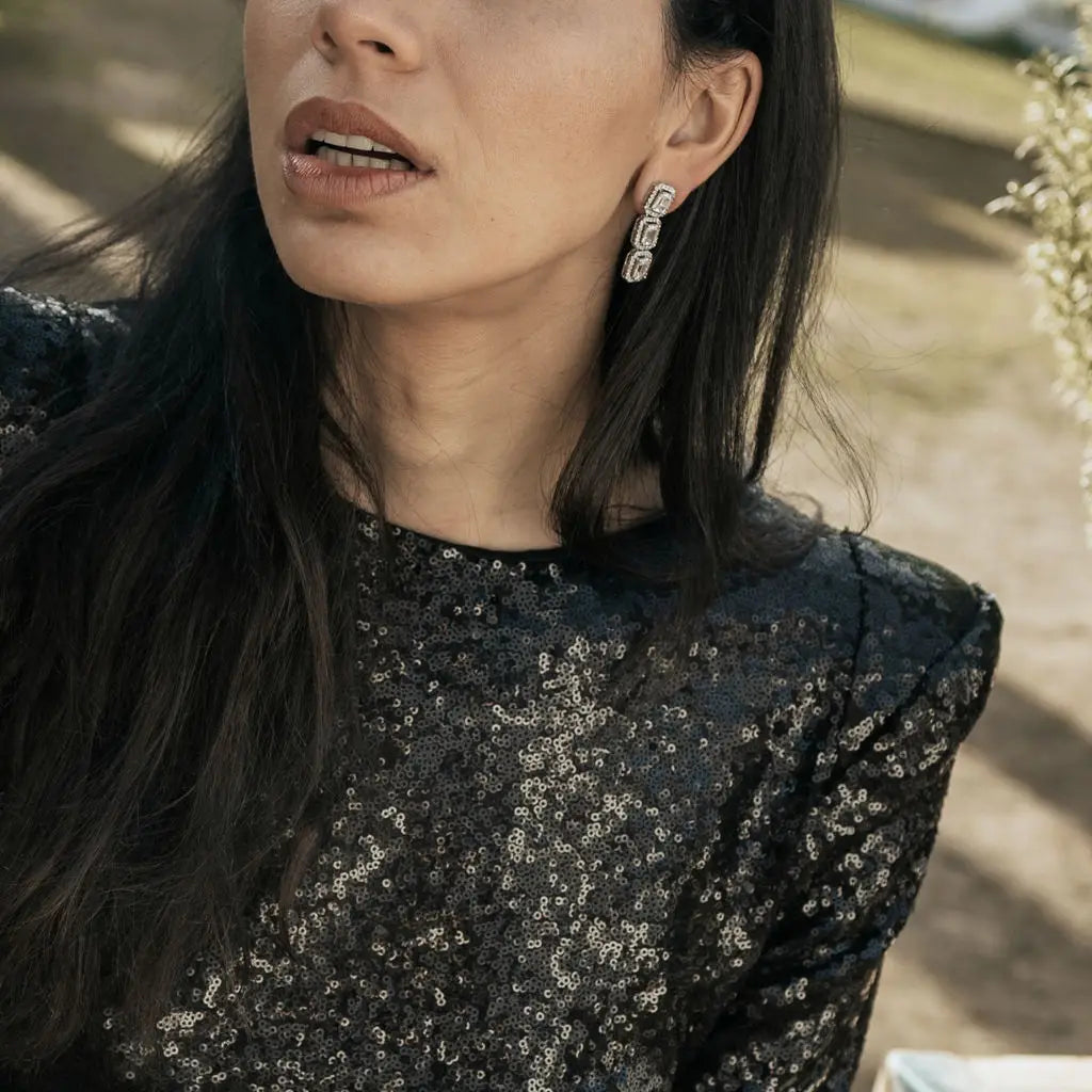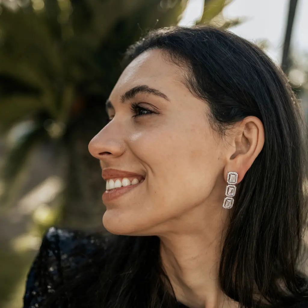 Estos pendientes presentan tres cristales dispuestos en vertical, cada uno enmarcado por un delicado halo de circonitas. Su diseño alargado crea un juego de brillo equilibrado y sofisticado, aportando una luminosidad que acompaña con sutileza cada movimiento.