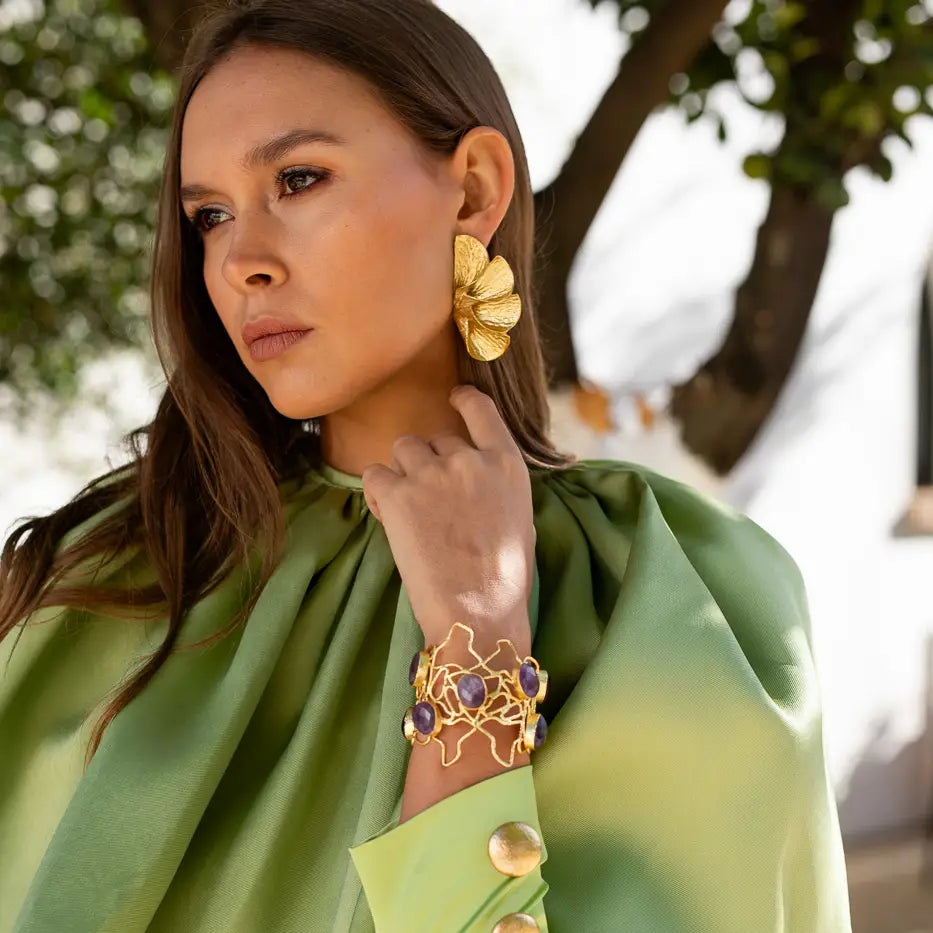 Estos pendientes de cuatro hojas plegadas son un auténtico lujo visual. Cada hoja, con su forma de cartucho, se superpone de manera precisa, formando una media circunferencia que abraza la oreja con elegancia y modernidad. La geometría y los pliegues capturan la luz de forma única, creando un brillo sofisticado que llama la atención sin esfuerzo. Un diseño escultórico y refinado, pensado para quienes buscan un accesorio impactante, elegante y absolutamente irresistible.