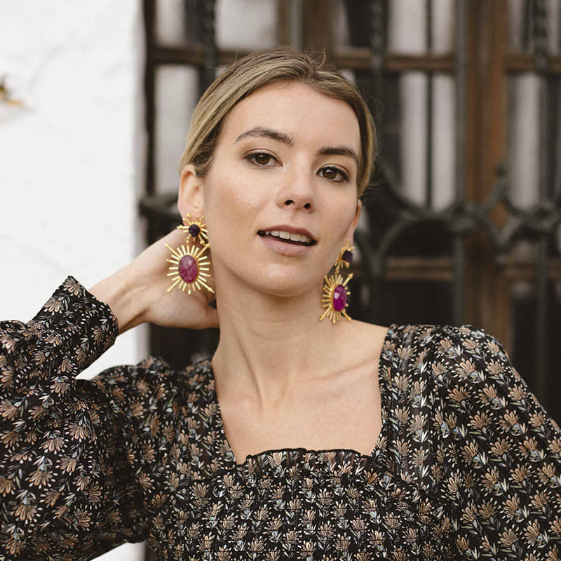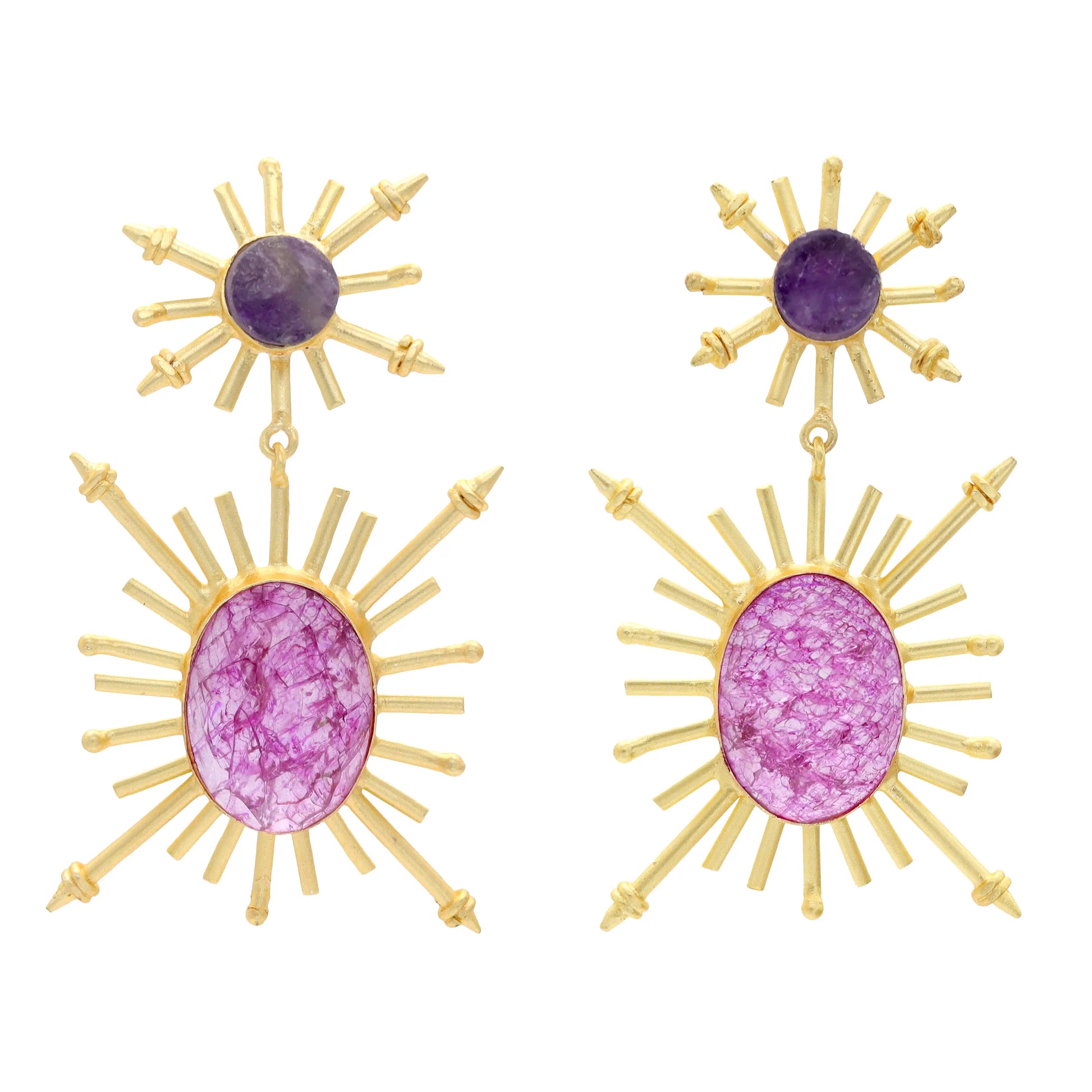 Este modelo impresionante presenta una piedra redonda central, de la cual emergen diversos rayos, y una forma ovalada inferior con líneas que se extienden en todas las direcciones, culminando en cuatro puntas. El diseño evoca la imagen de dos soles, creando un impacto visual único. Este modelo grande y vistoso no dejará indiferente a nadie, siendo la elección perfecta para quienes buscan un accesorio llamativo y lleno de energía. Añade un toque de elegancia y originalidad a tus looks con estos pendientes que destacarán tu estilo con su presencia imponente.