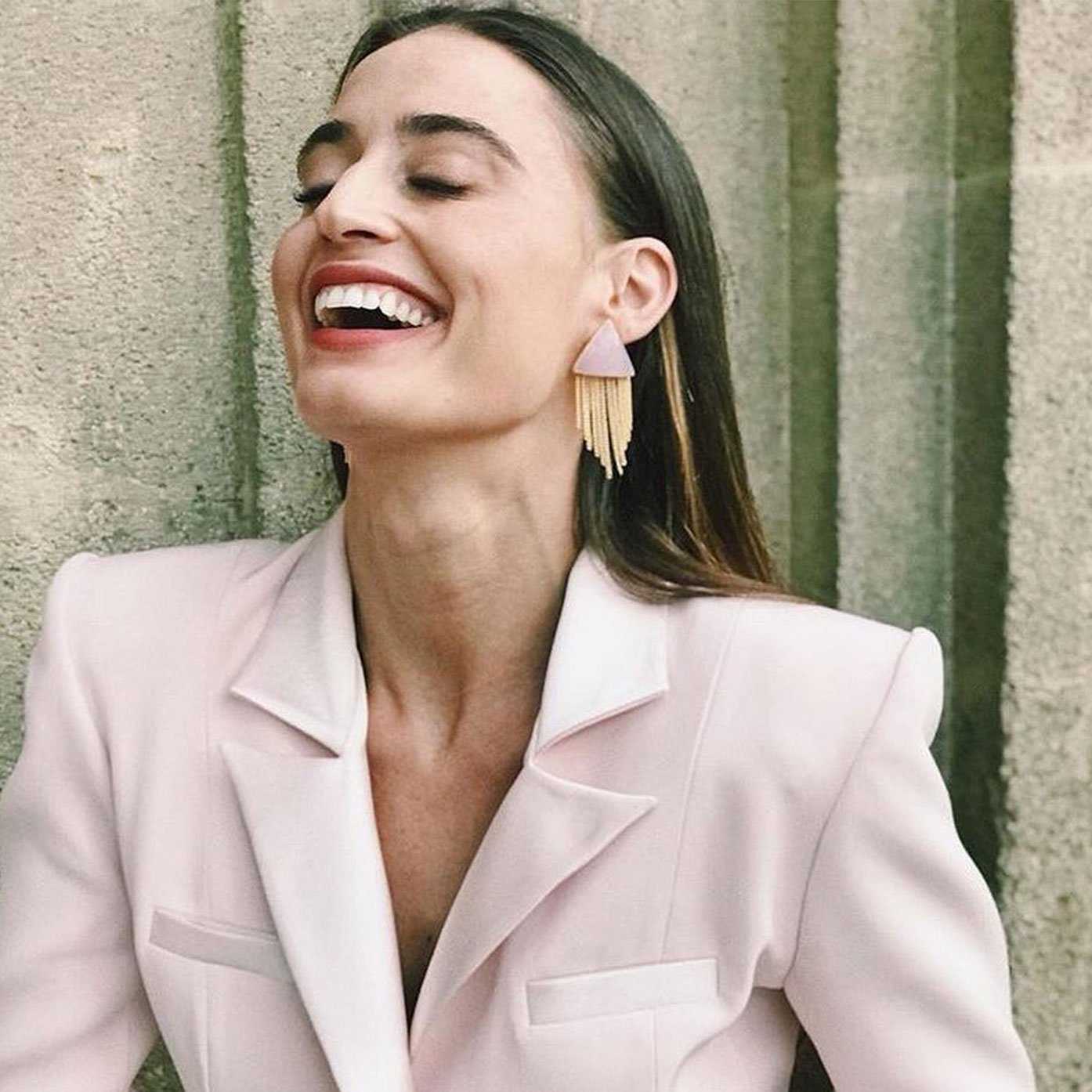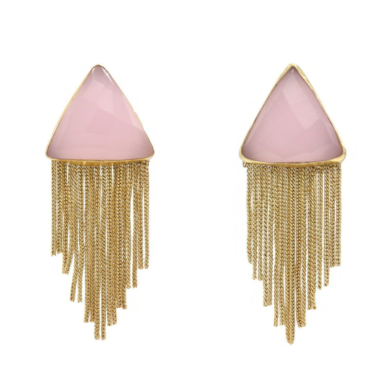 Pendientes impactantes con una piedra triangular que cobra protagonismo, mientras abajo, cadenas de diferentes tamaños crean elegantes flecos en movimiento. Este diseño fusiona geometría y dinamismo, añadiendo un toque moderno y sofisticado a tu look.