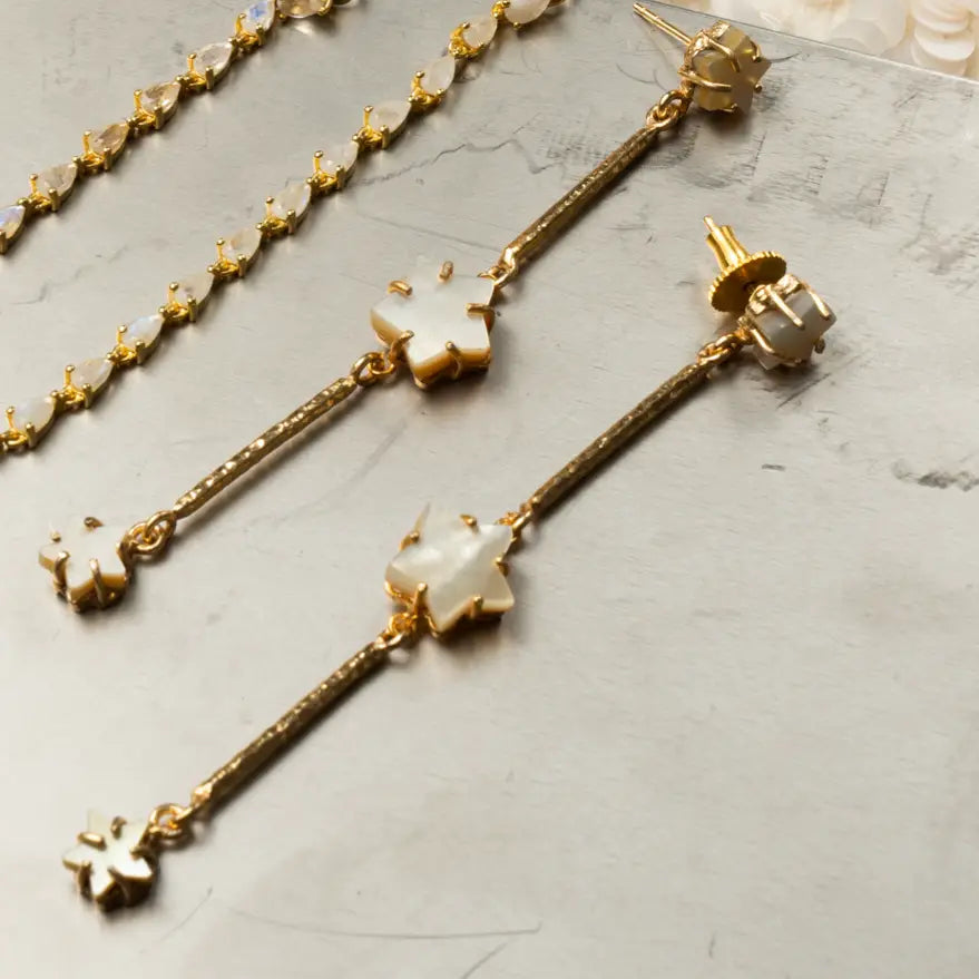 Sumérgete en el misterio y la belleza del cosmos con los pendientes de la colección L'étoile, un diseño que captura la esencia enigmática de las estrellas. Estos pendientes delicadamente alargados presentan un brillo dorado que conjuga una elegancia celestial con modernas gotas de luz que recuerdan la pureza de una noche estrellada.