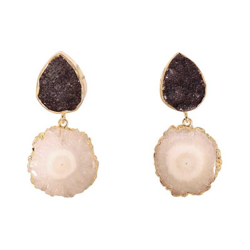 Pendientes formados por dos piedras: una en forma de gota y otra circular. Este diseño refleja la dedicación artesanal, destacando por su elegancia sutil y atemporal.